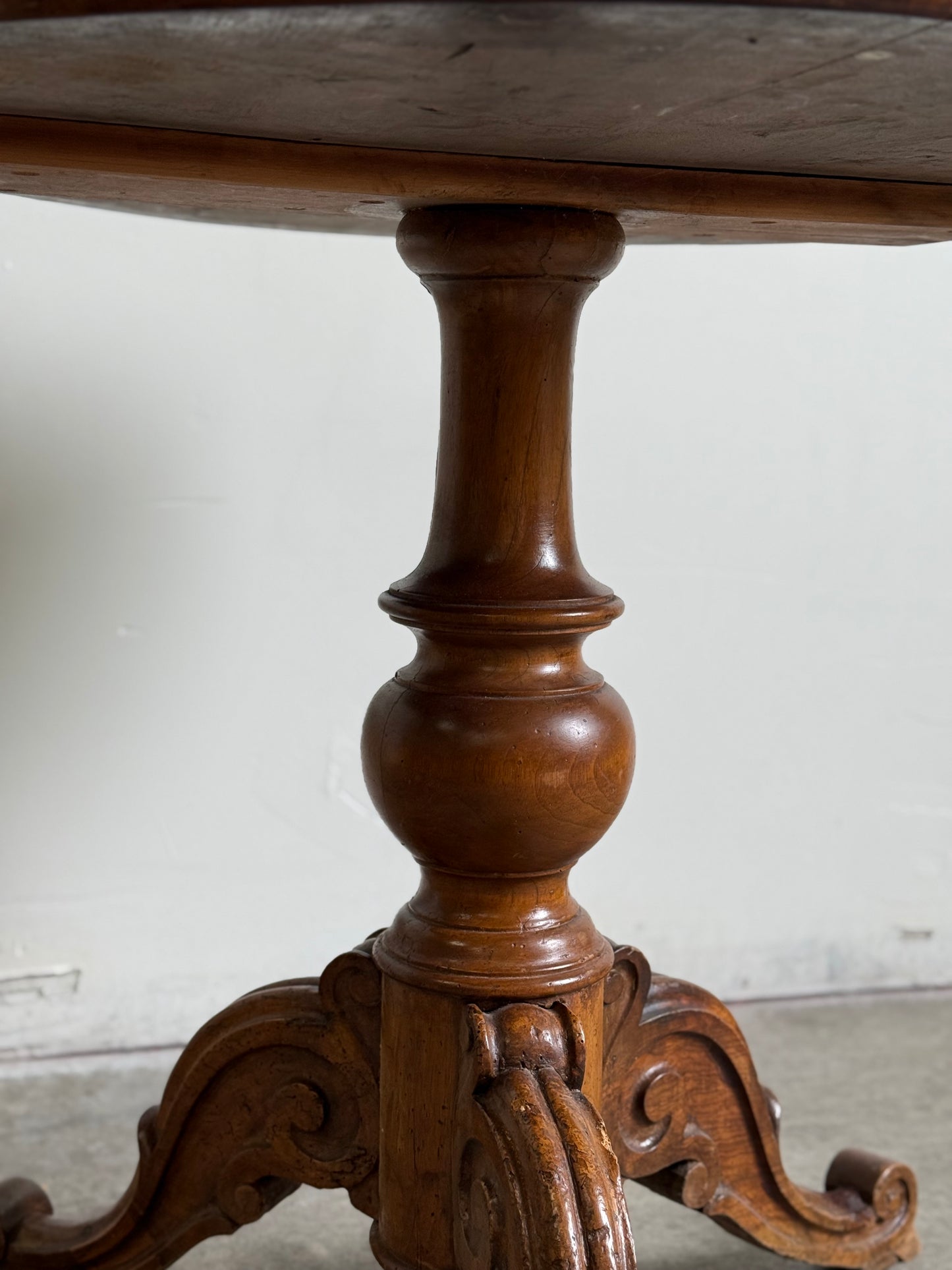 Beautiful antique English turned pedestal and on three carved Legs. Gorgeous Patina. Very solid and the perfect height for dining. Late 18th or early 19th C.