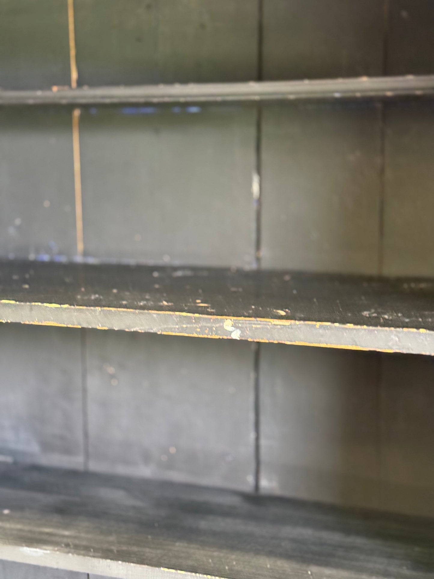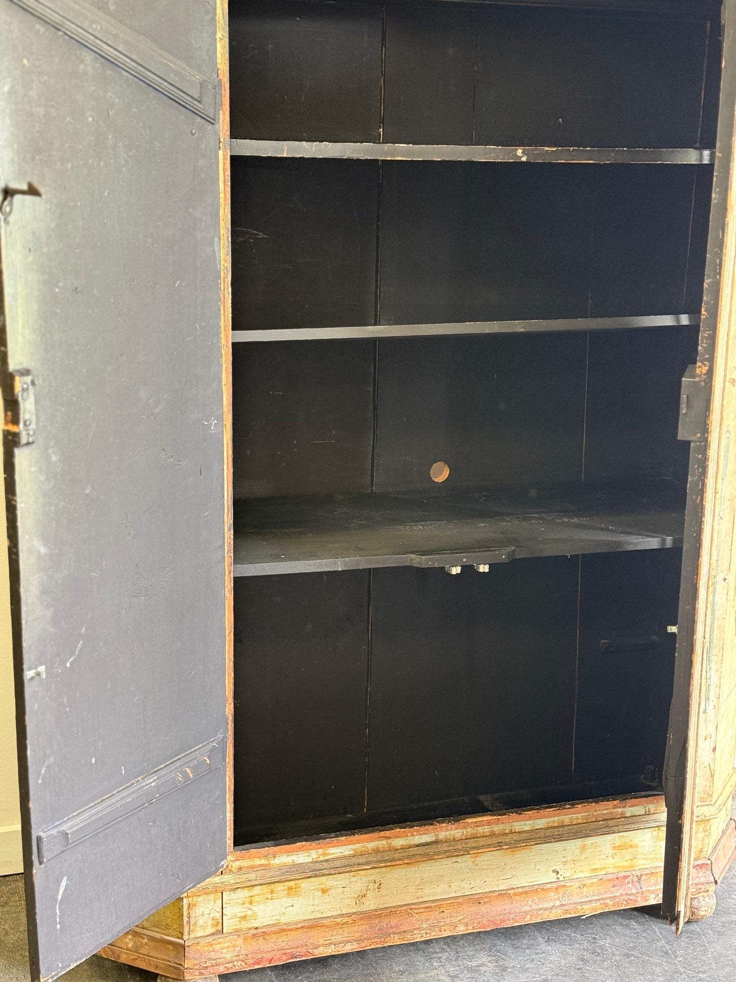 A large antique German or French painted wood wardrobe, with two doors on ball feet. Inscription above door reads, Josepha Kapfer von Schwangan, 1833. There is also some writing on the back that says Paris. This piece is such a vibe. The colors are really beautiful. The black matte interior has a bluish cast and is striking against the light exterior. Very solid condition with original key.