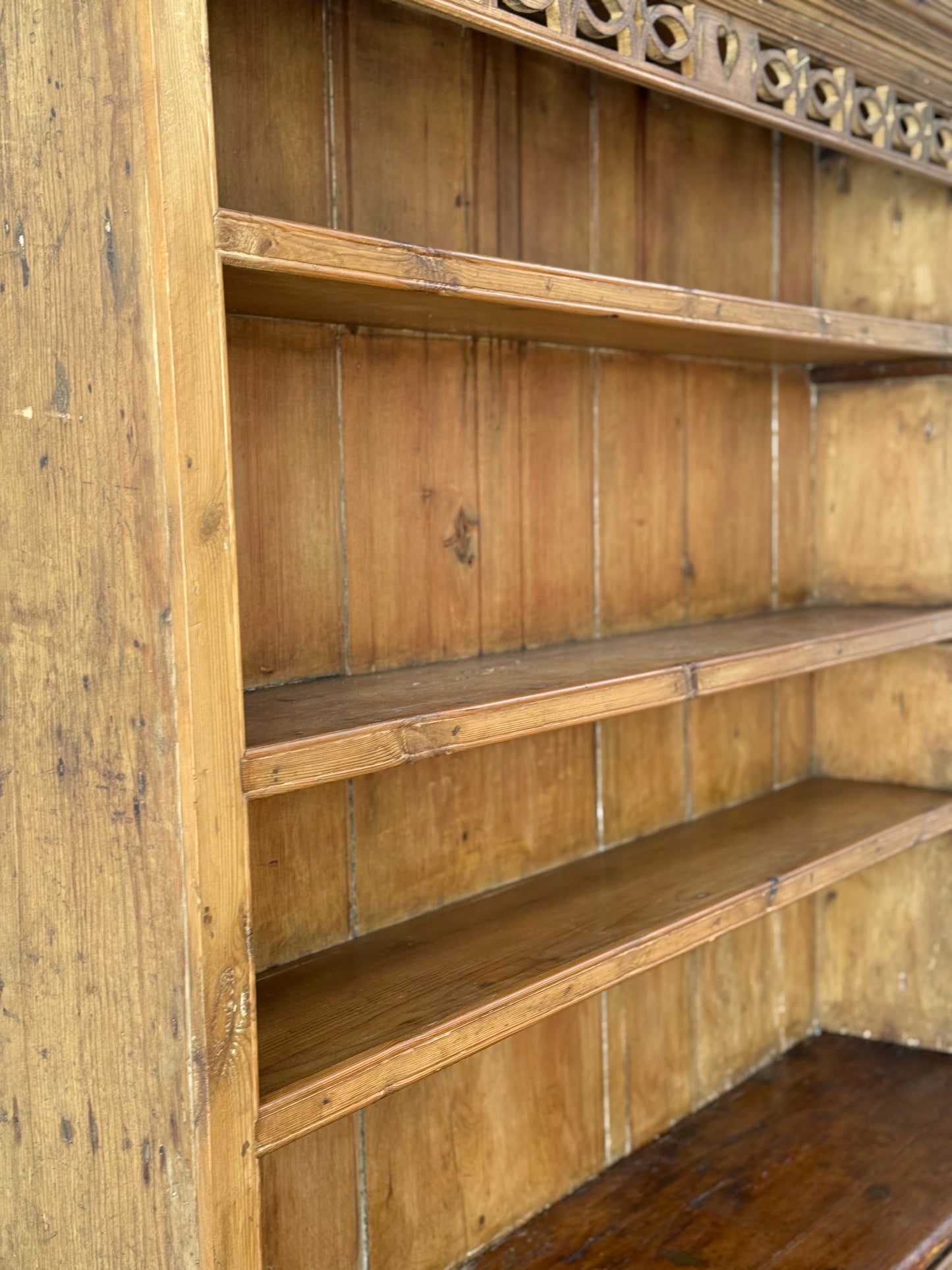 This charming Antique Irish Pine Two-Part Hutch features an open top adorned with heart and clover designs, offering four deep shelves above three spacious drawers. It includes a wine rack and a unique sliding access to the lower storage area, blending functionality with delicate detailing for a truly special piece.