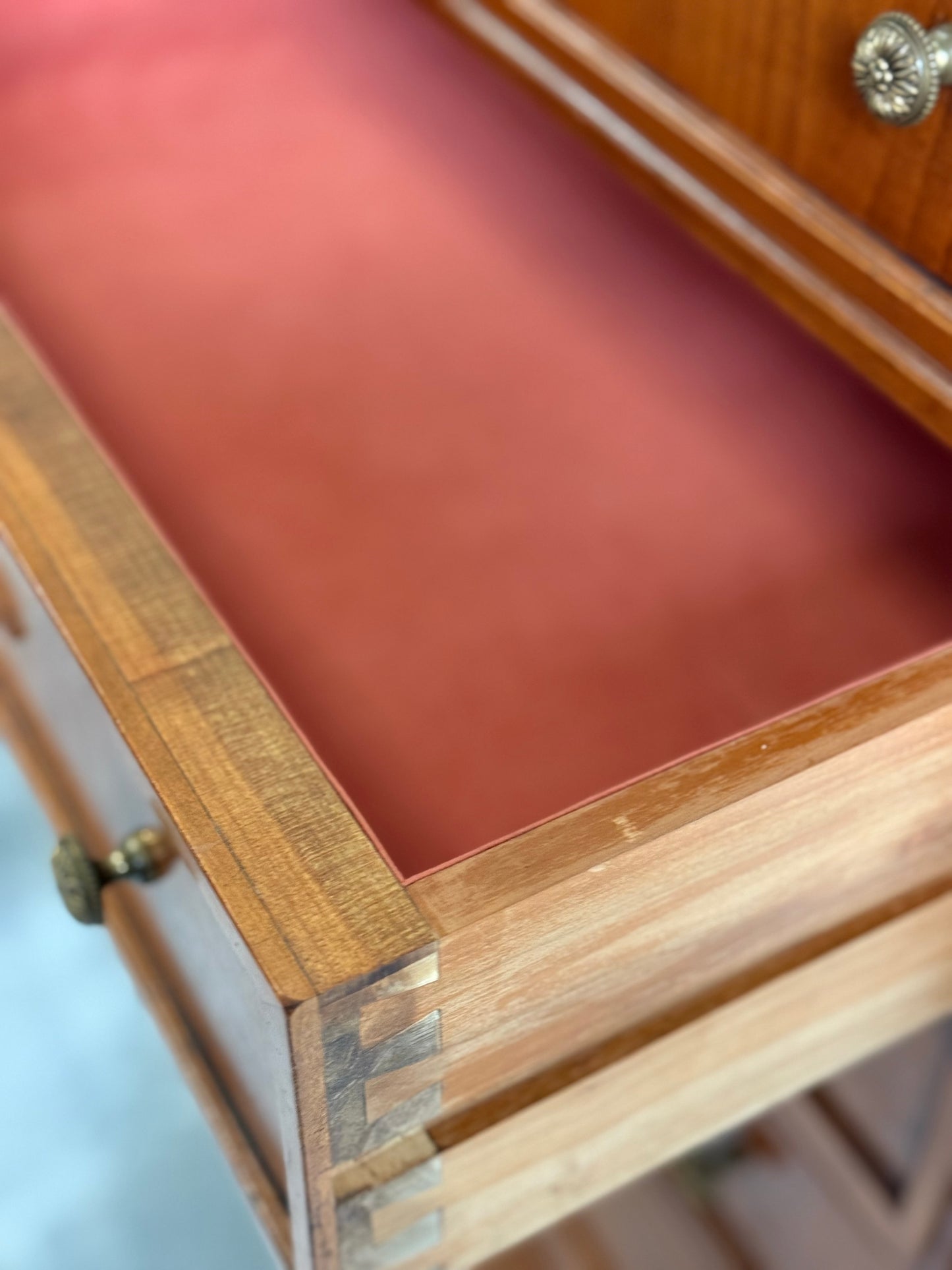 Very nice vintage French Chest of drawers in excellent condition. Lovely pink velvet lined drawers. Pretty details with seven drawers raised on turned legs.