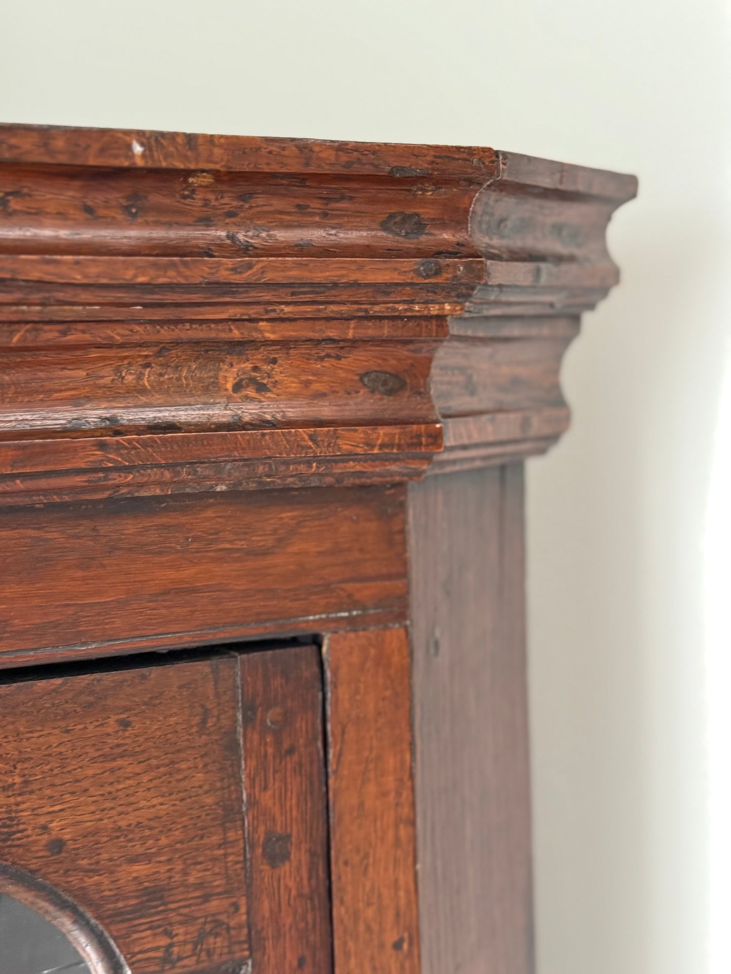 Petite George III Oak Corner Cupboard, glazed mullioned doors with wavy glass. Such an unusual piece at this size. Two panes have cracks but are still sound.