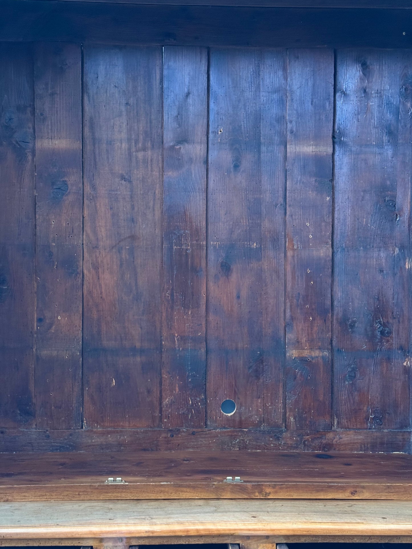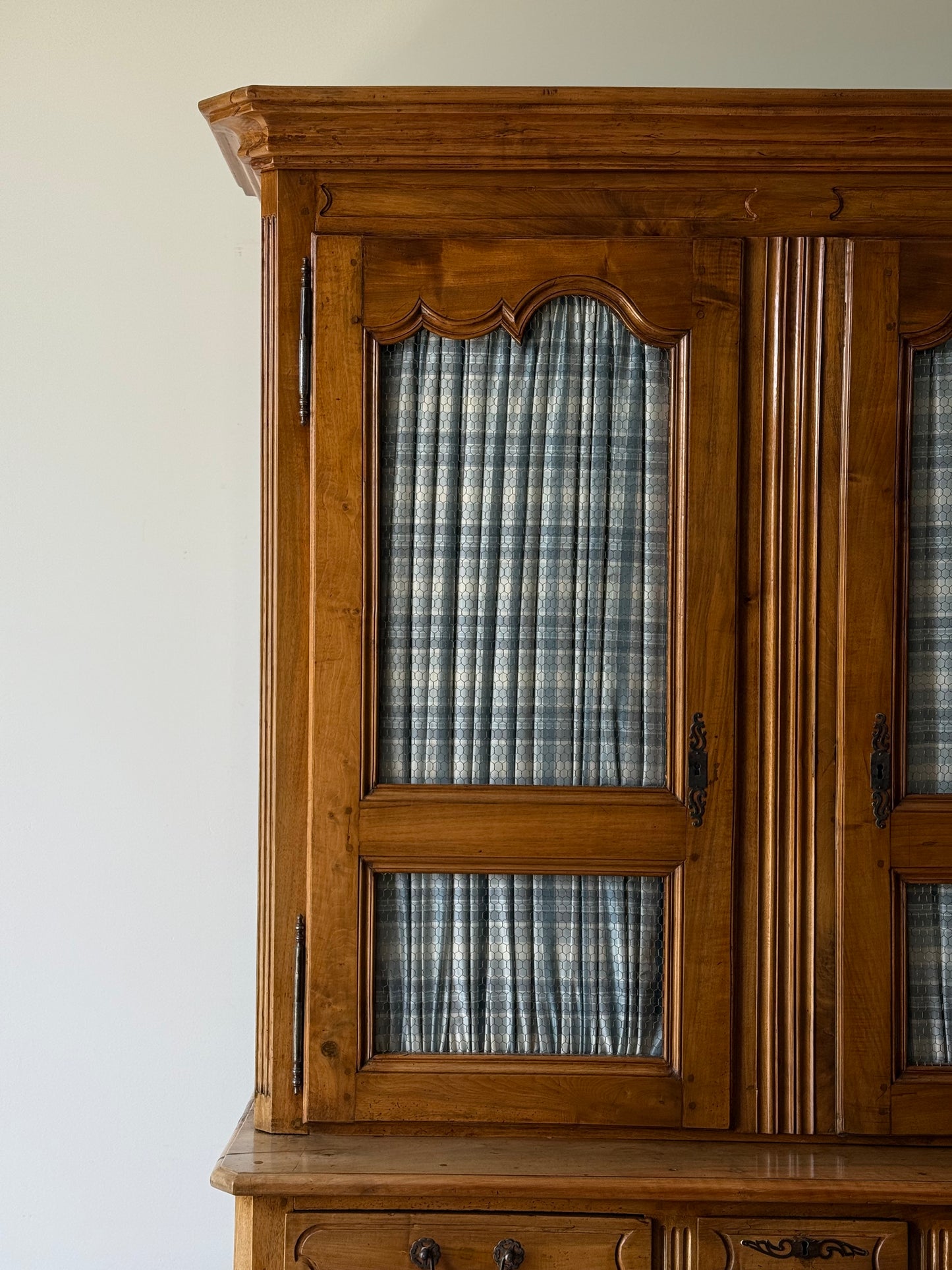 Wow! This one is so gorgeous! An oversized Louis XV Provincial Walnut Bibliotheque top having mesh inset doors with lovely plaid backing. Upper piece with doors set on base having three drawers over two doors. This piece is really solid and in great shape considering its age. The interior of the base has had some venting holes neatly cut out for electronics but it in no way detracts from the overall appearance of this Bookcase. A really spectacular example of 18th Century French Provincial.