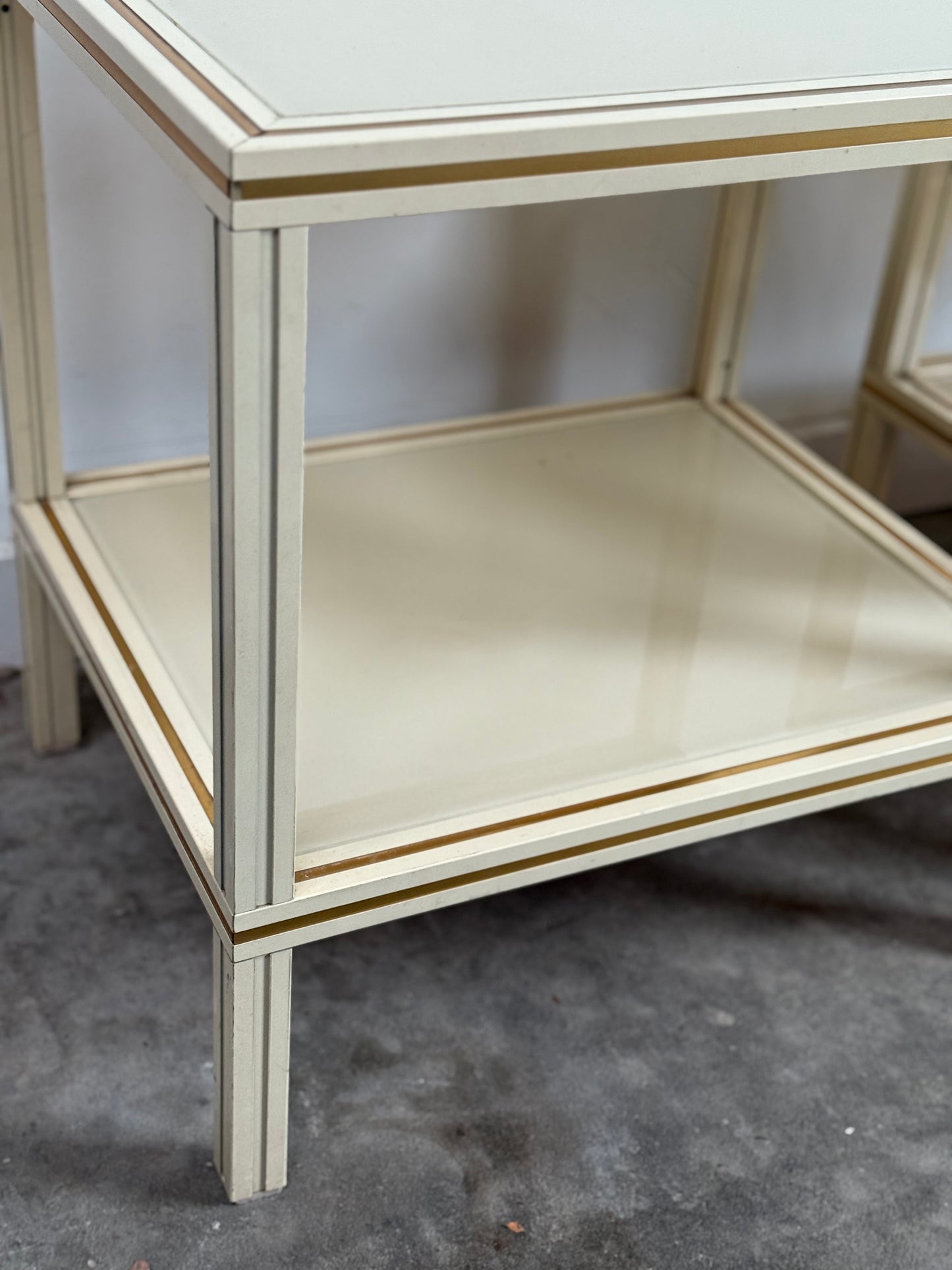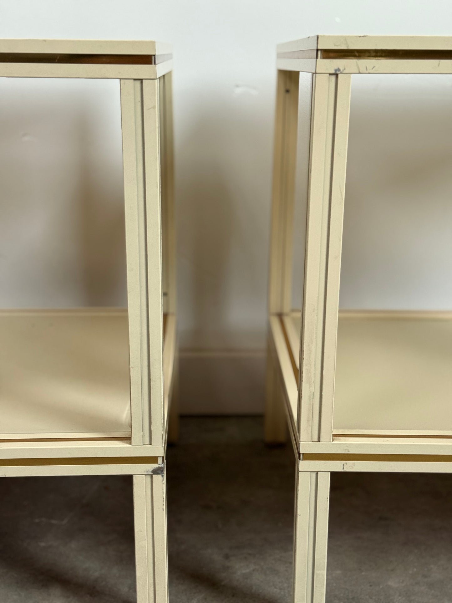 Elegant two-tier side tables from Pierre Vandel Paris, featuring a cream aluminum frame paired with glass shelves. This matching pair brings timeless vintage style to any room, offering both storage and sophisticated design in one functional piece.