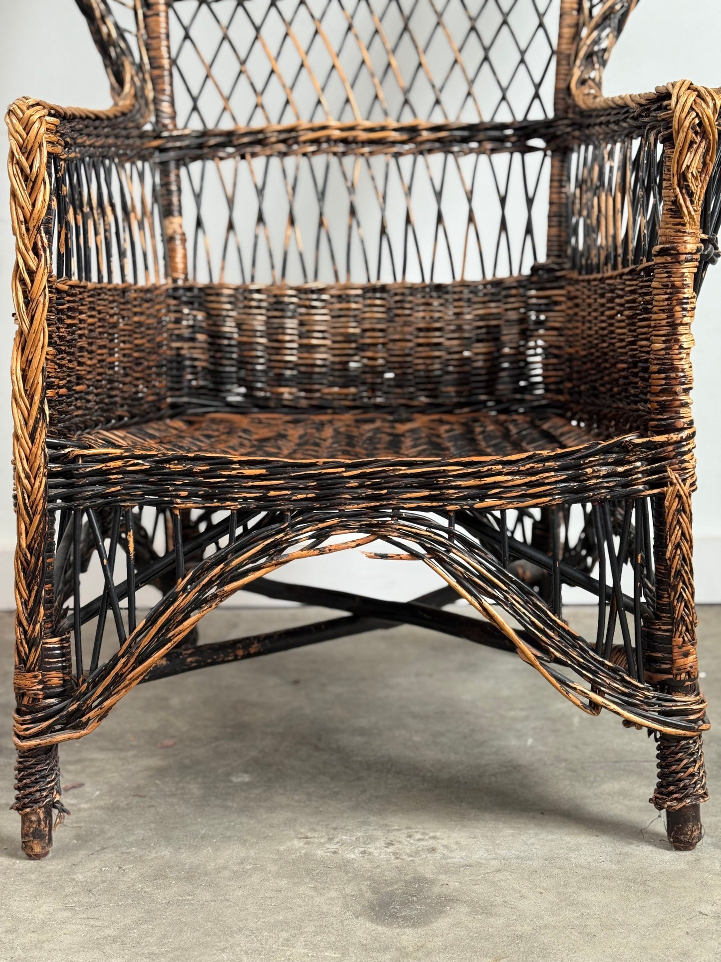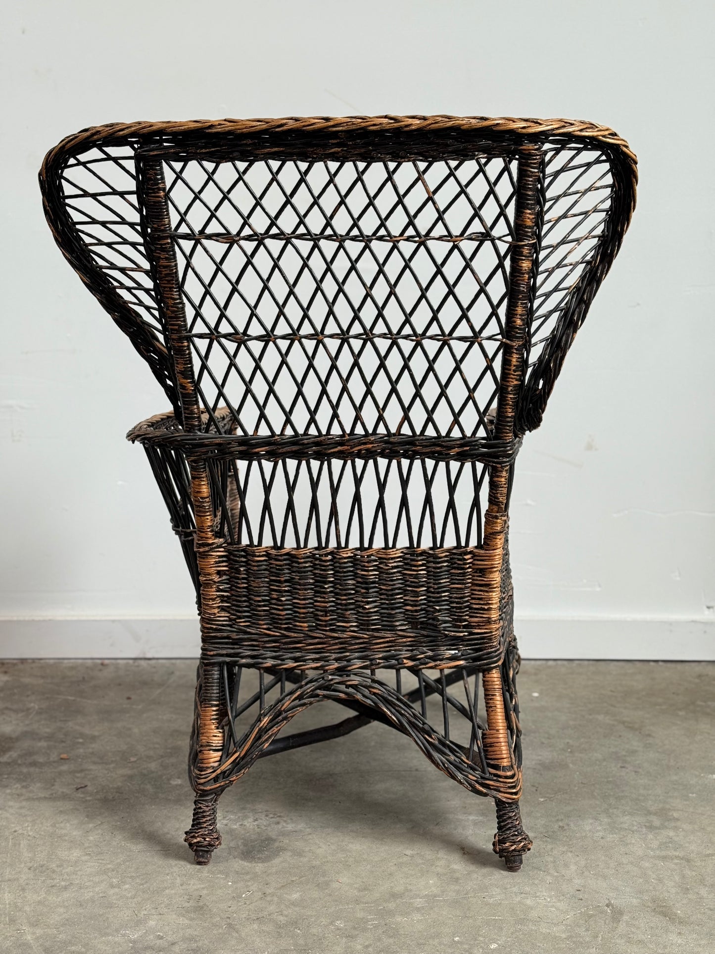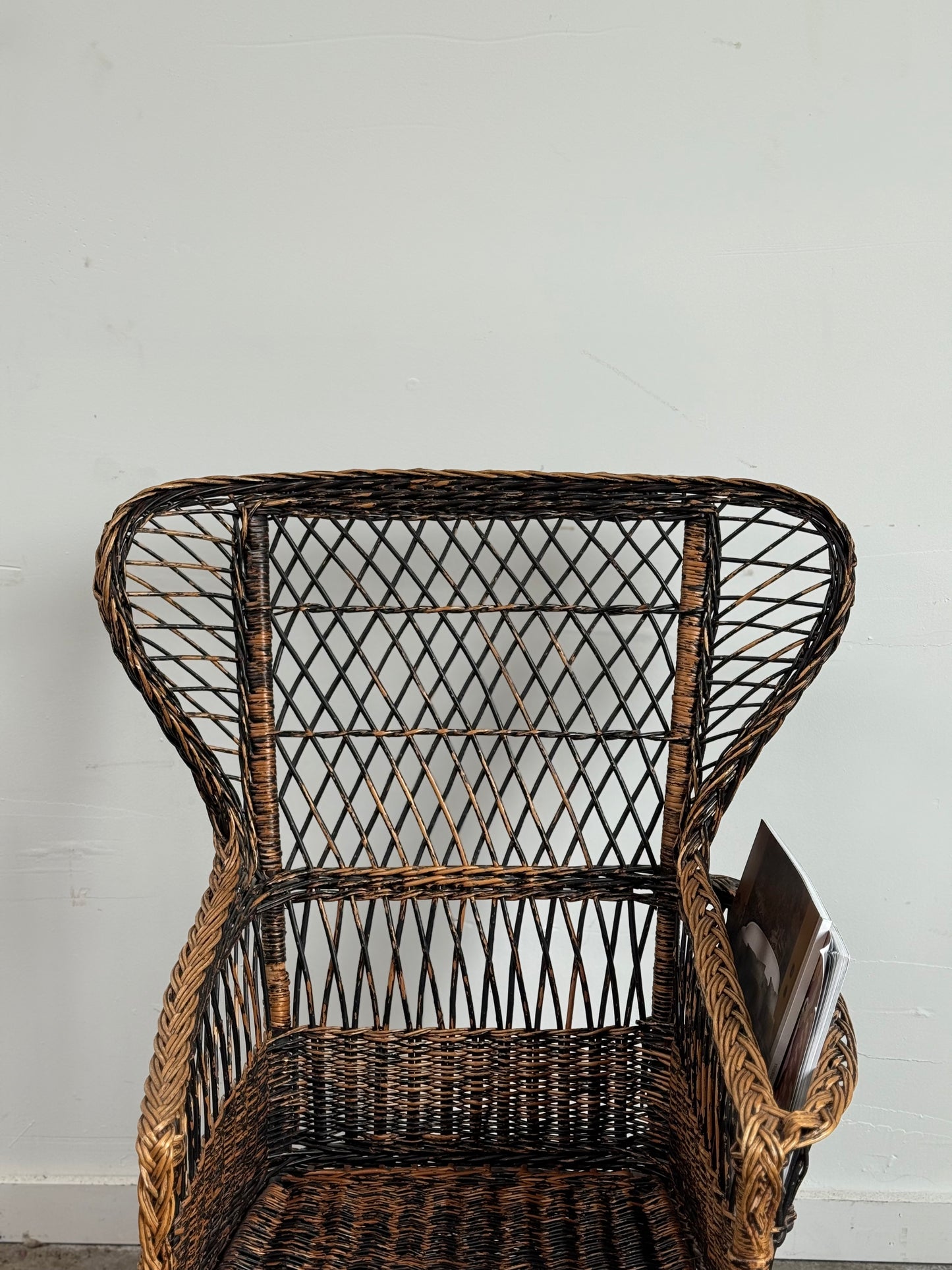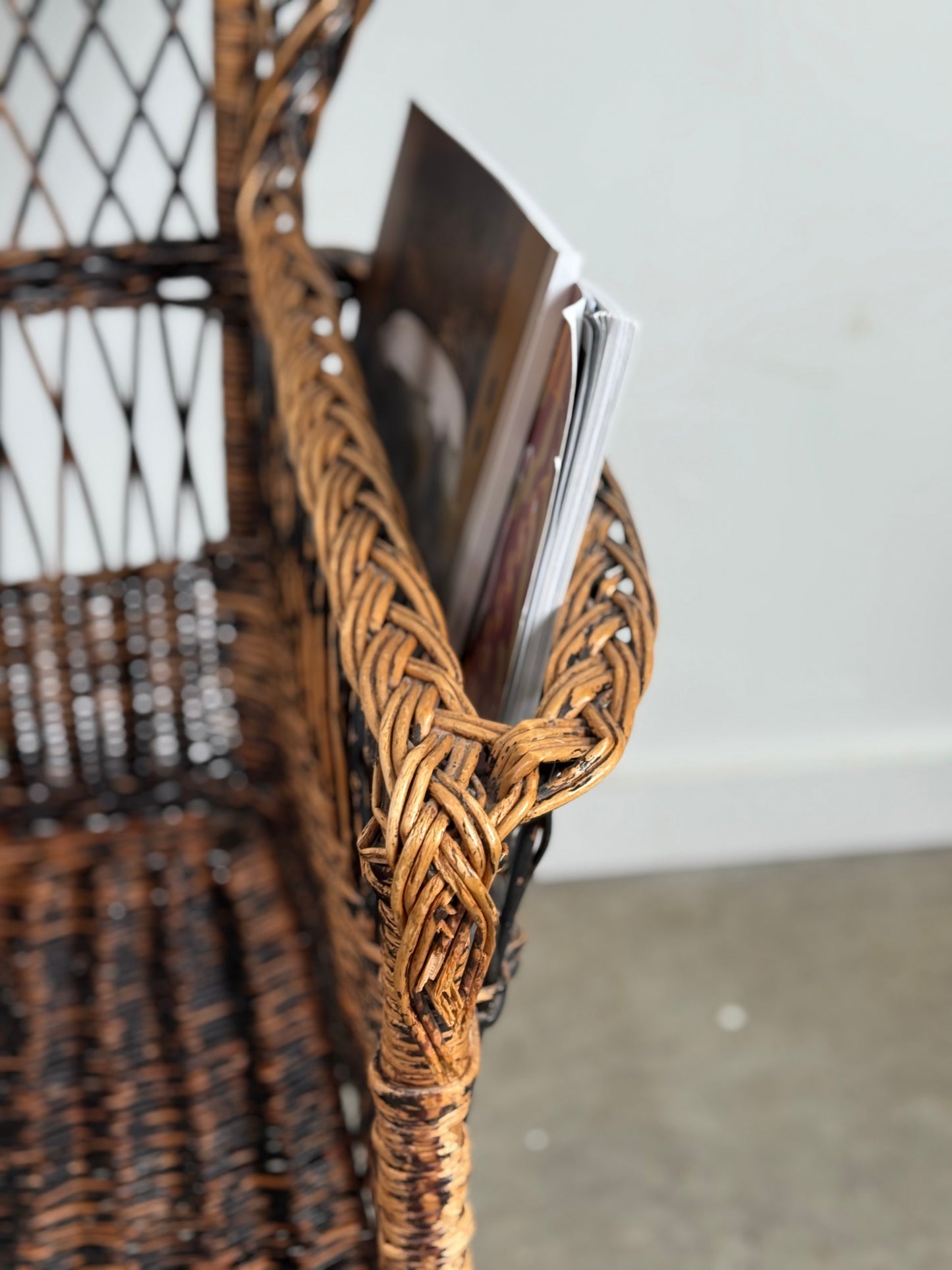 This charming wingback wicker chair brings timeless elegance to any room. Crafted in excellent condition, it features a convenient built-in magazine rack along the arm—perfect for keeping reading materials within reach. The classic design and sturdy wicker construction make it both a functional and stylish addition to your home.