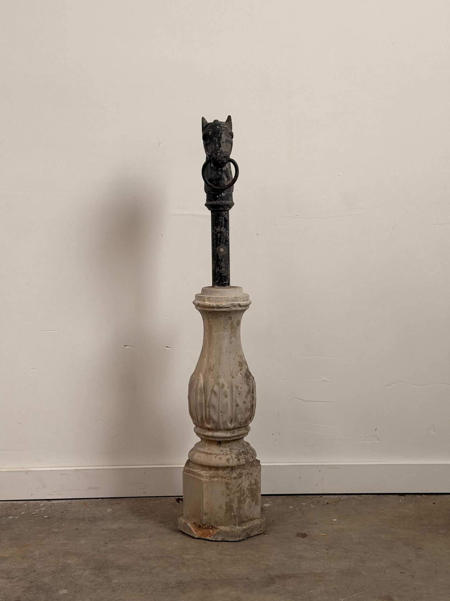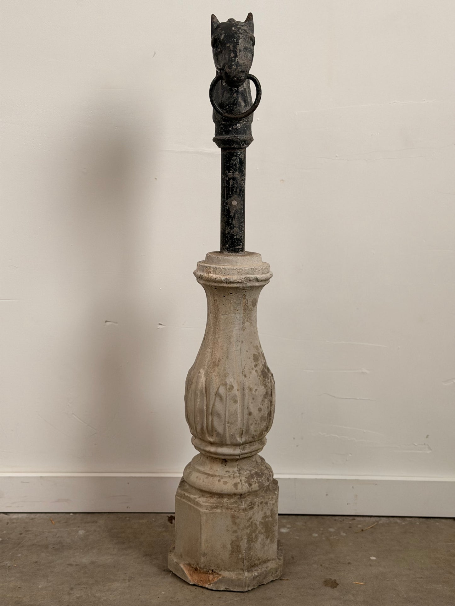 Antique Cast iron horse head hitching post mounted on concrete pedestal. Very cool piece.