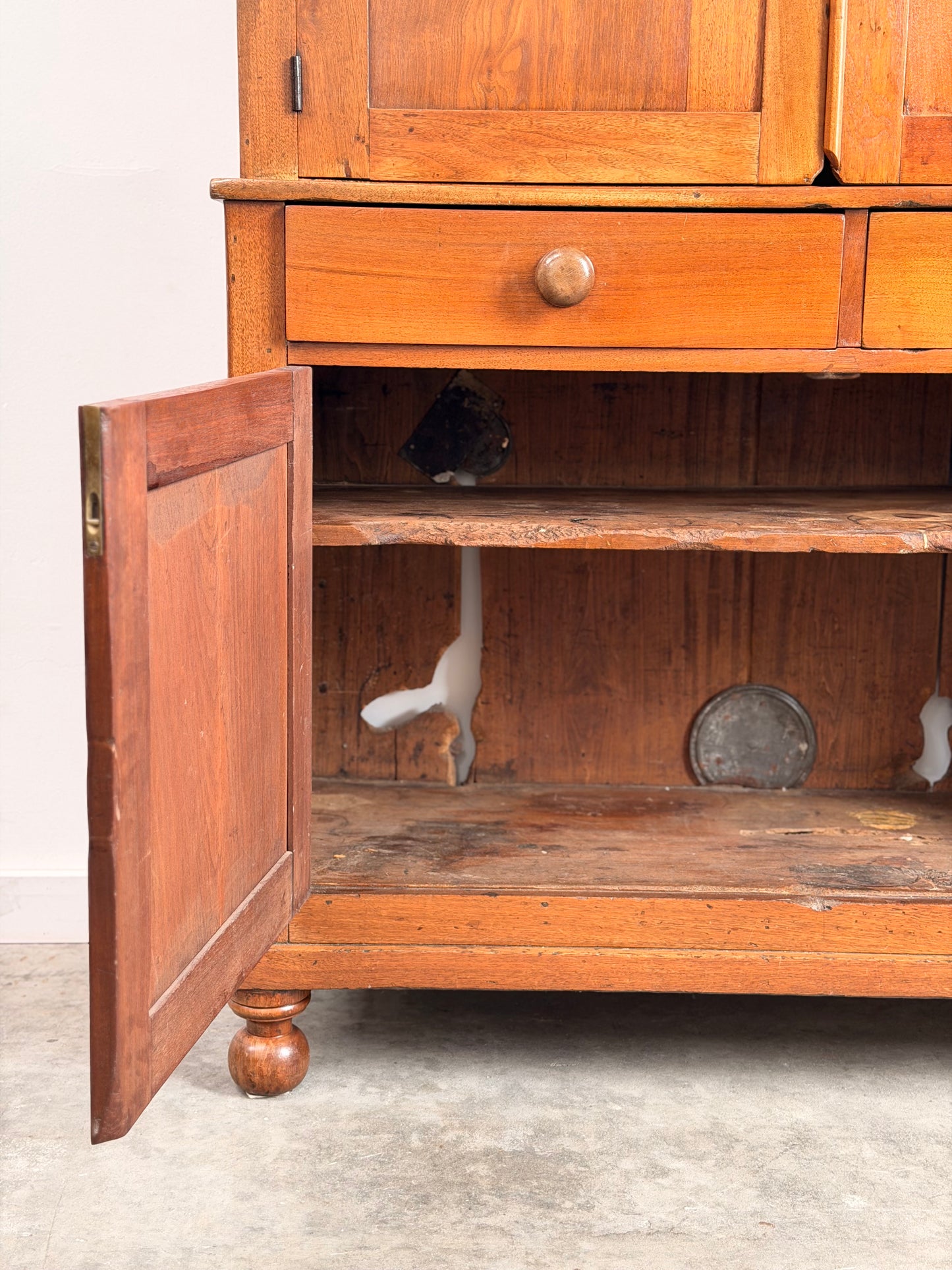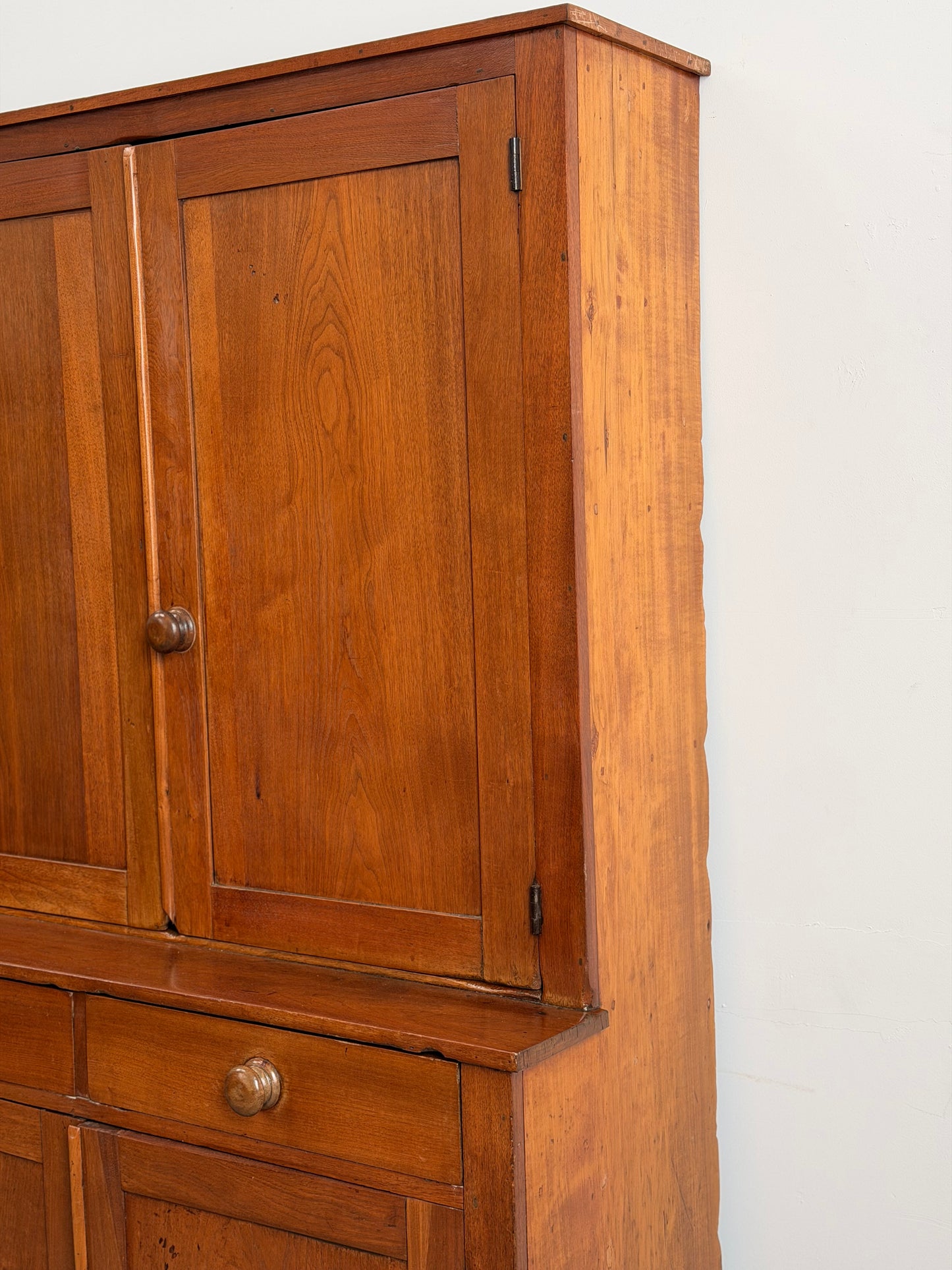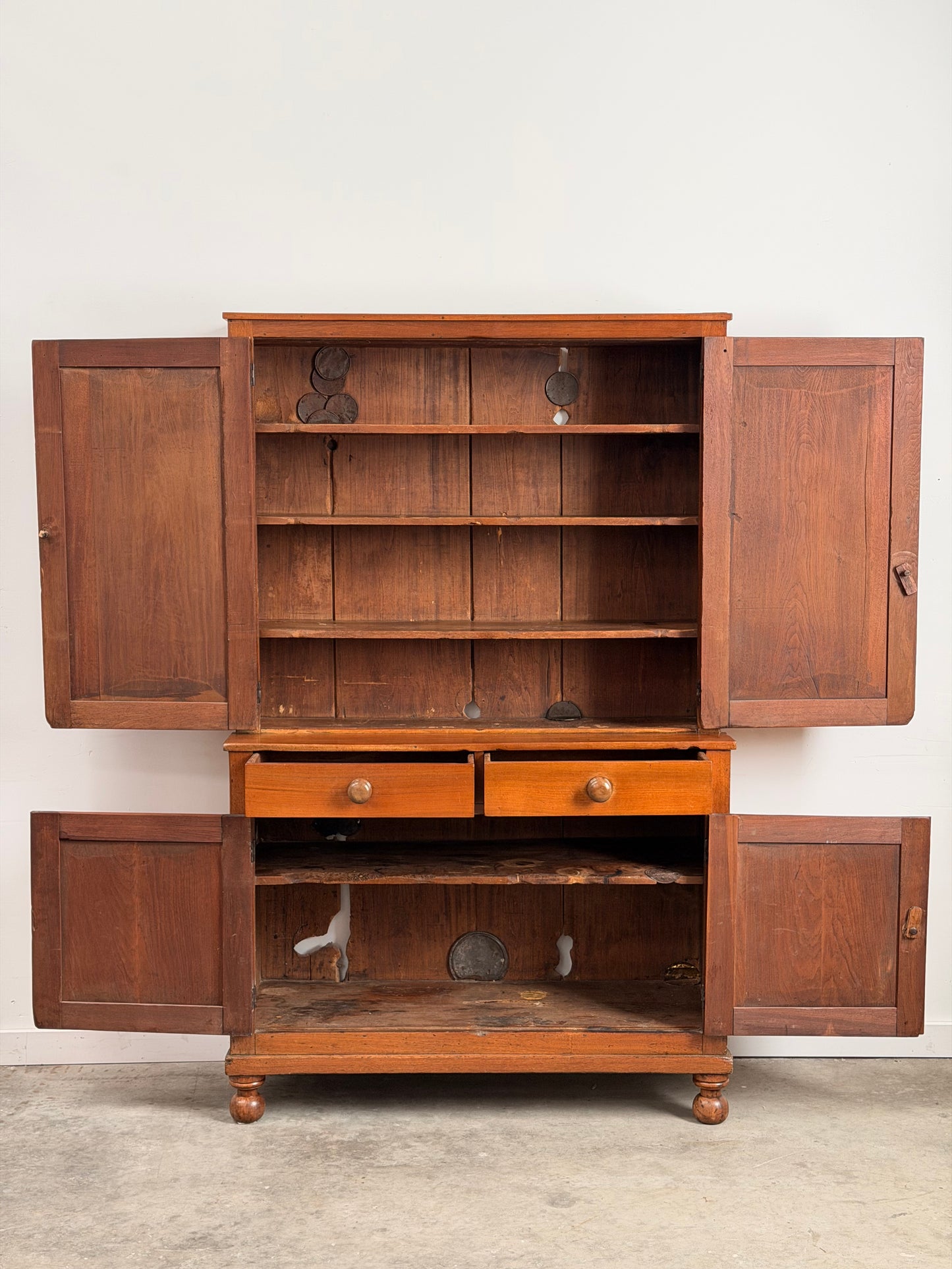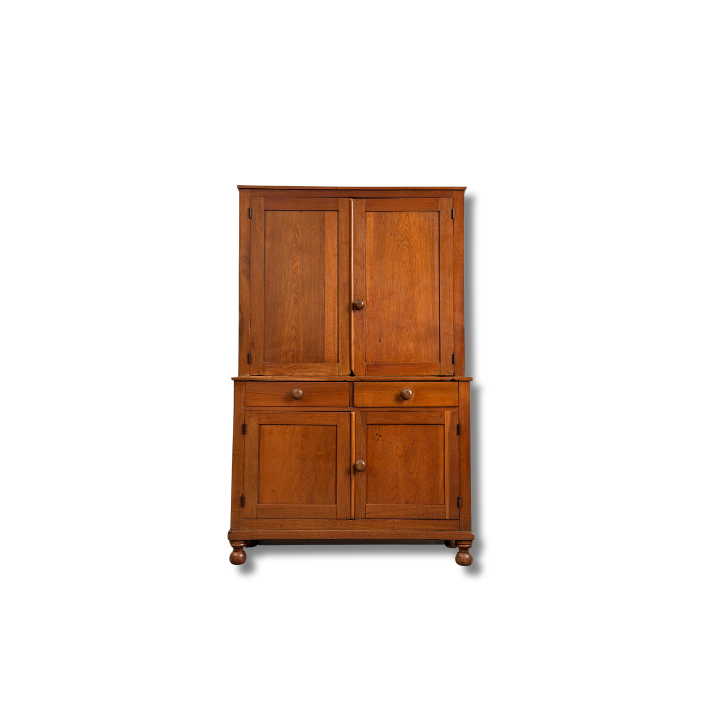 A ca. 1840 one-piece country set back cupboard with a butternut front and pine sides, the top has two paneled doors with three fixed shelves on the interior, and the bottom has two dovetailed drawers over two paneled doors with a single fixed shelf interior, on ball feet. Very clean. Old animal holes. Really stunning presentation.