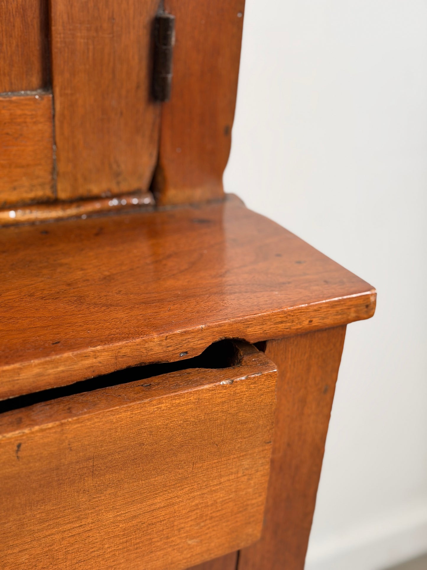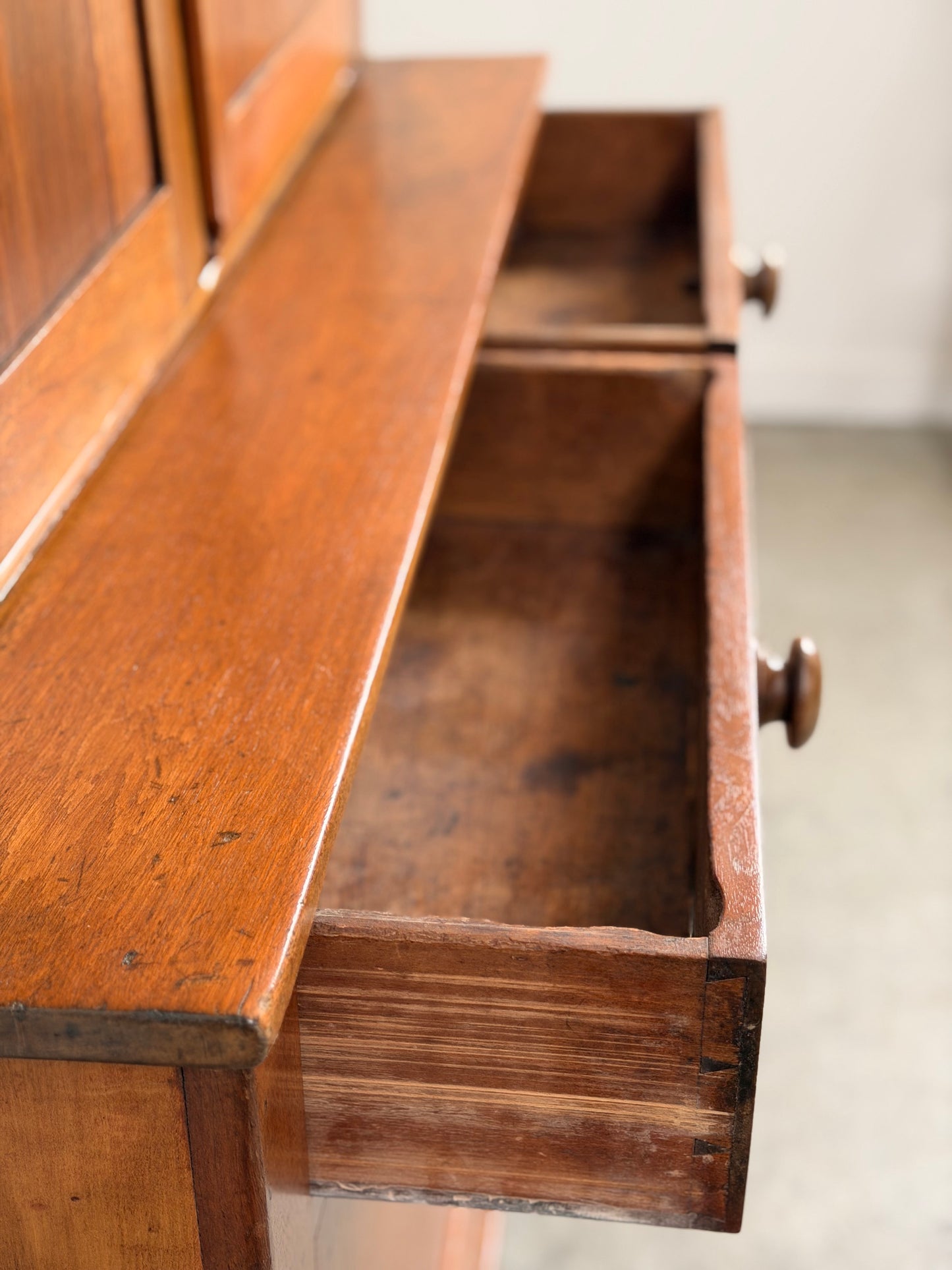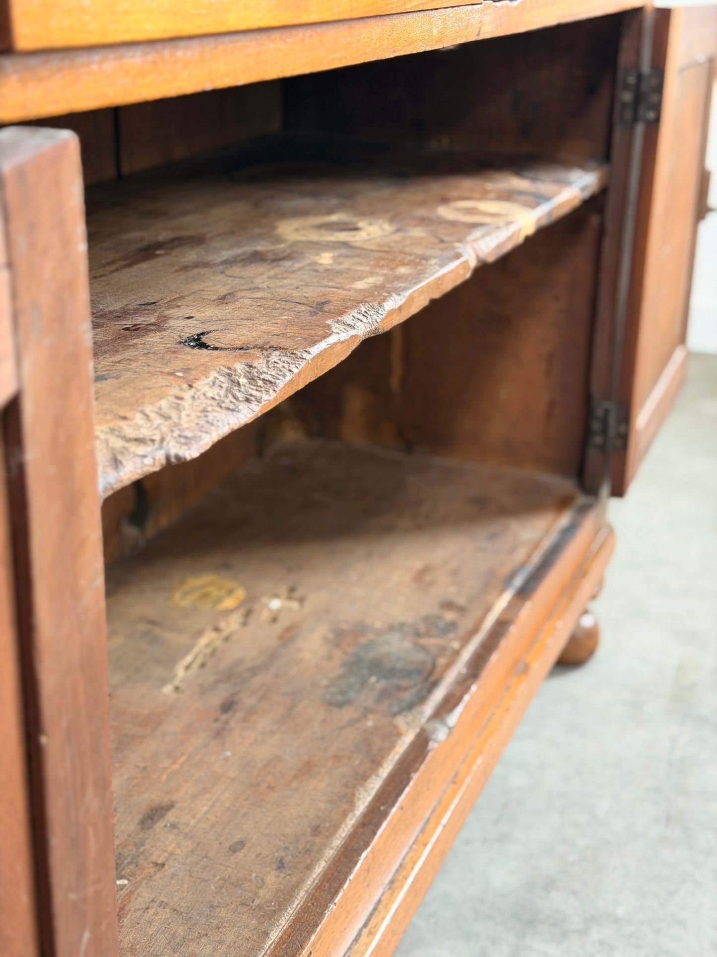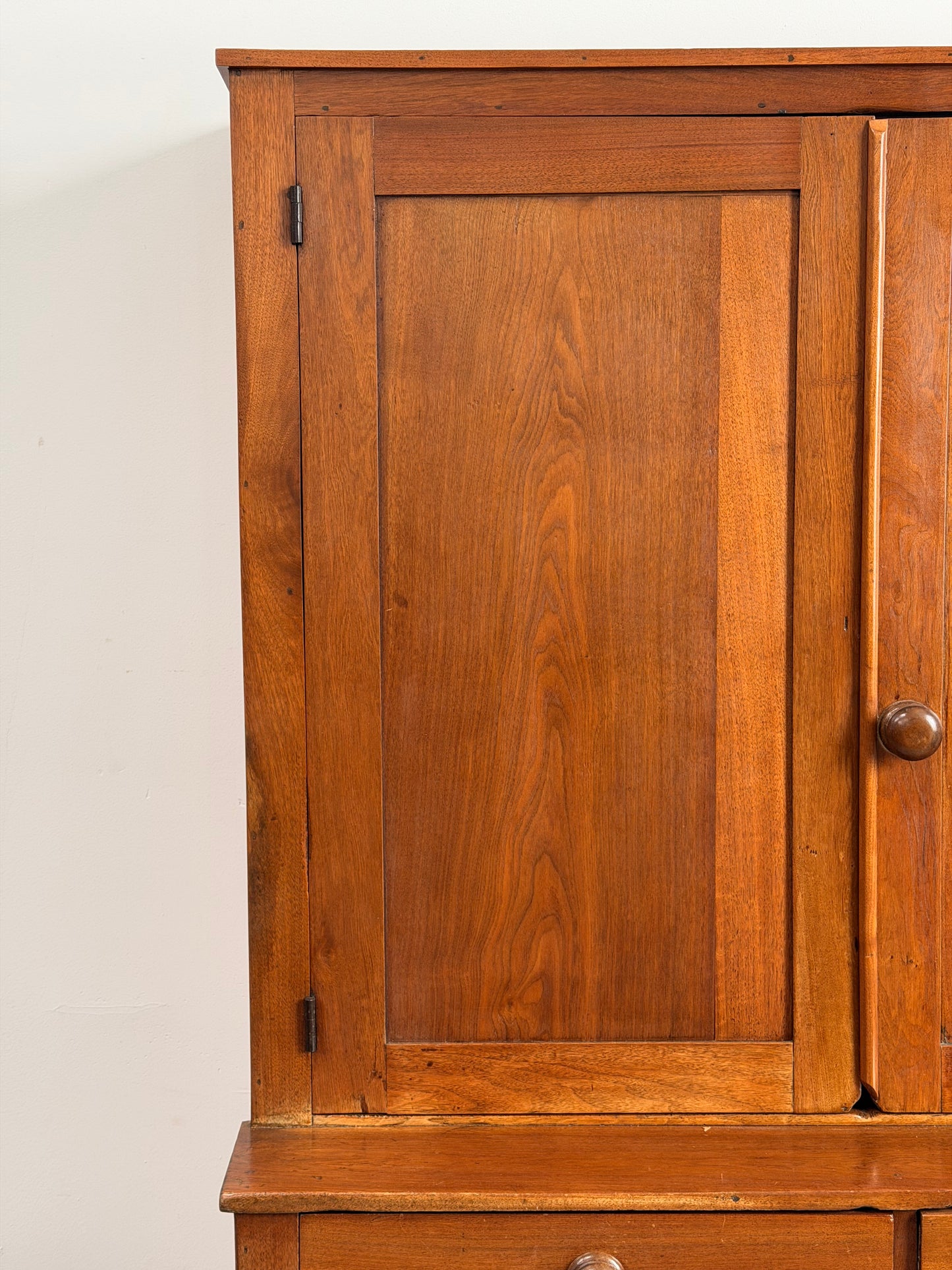 A ca. 1840 one-piece country set back cupboard with a butternut front and pine sides, the top has two paneled doors with three fixed shelves on the interior, and the bottom has two dovetailed drawers over two paneled doors with a single fixed shelf interior, on ball feet. Very clean. Old animal holes. Really stunning presentation.