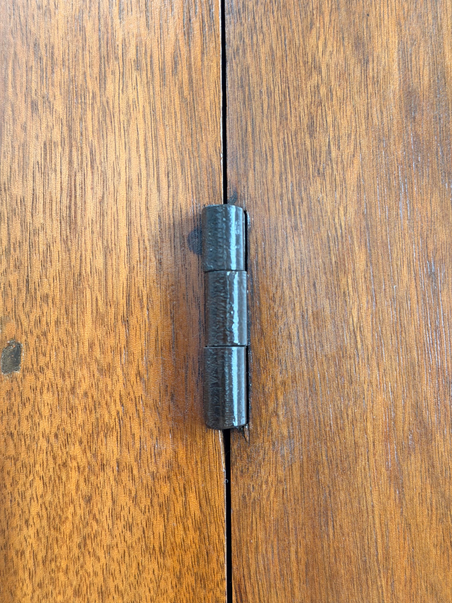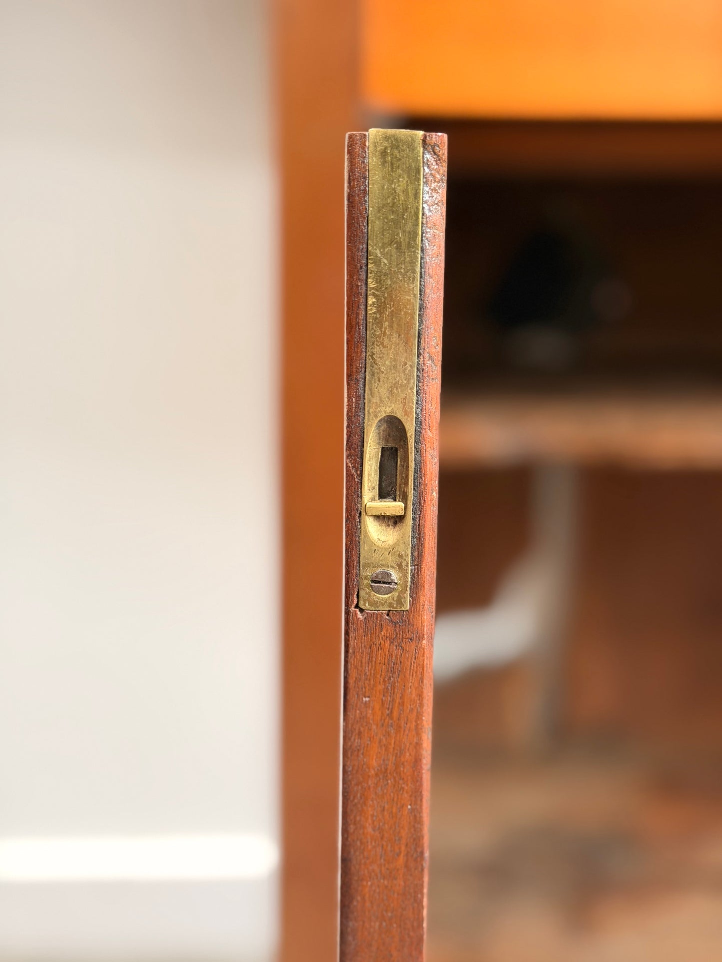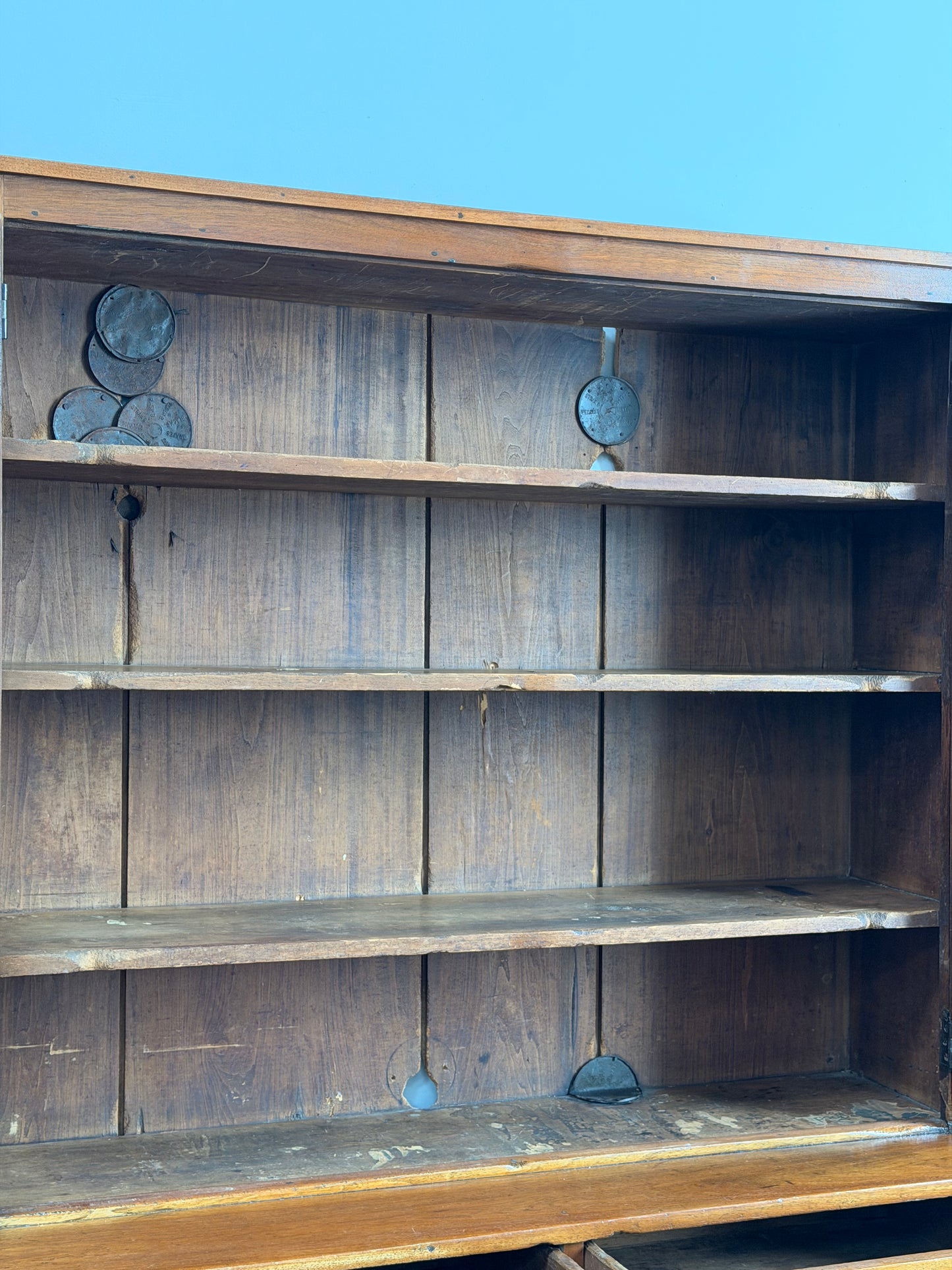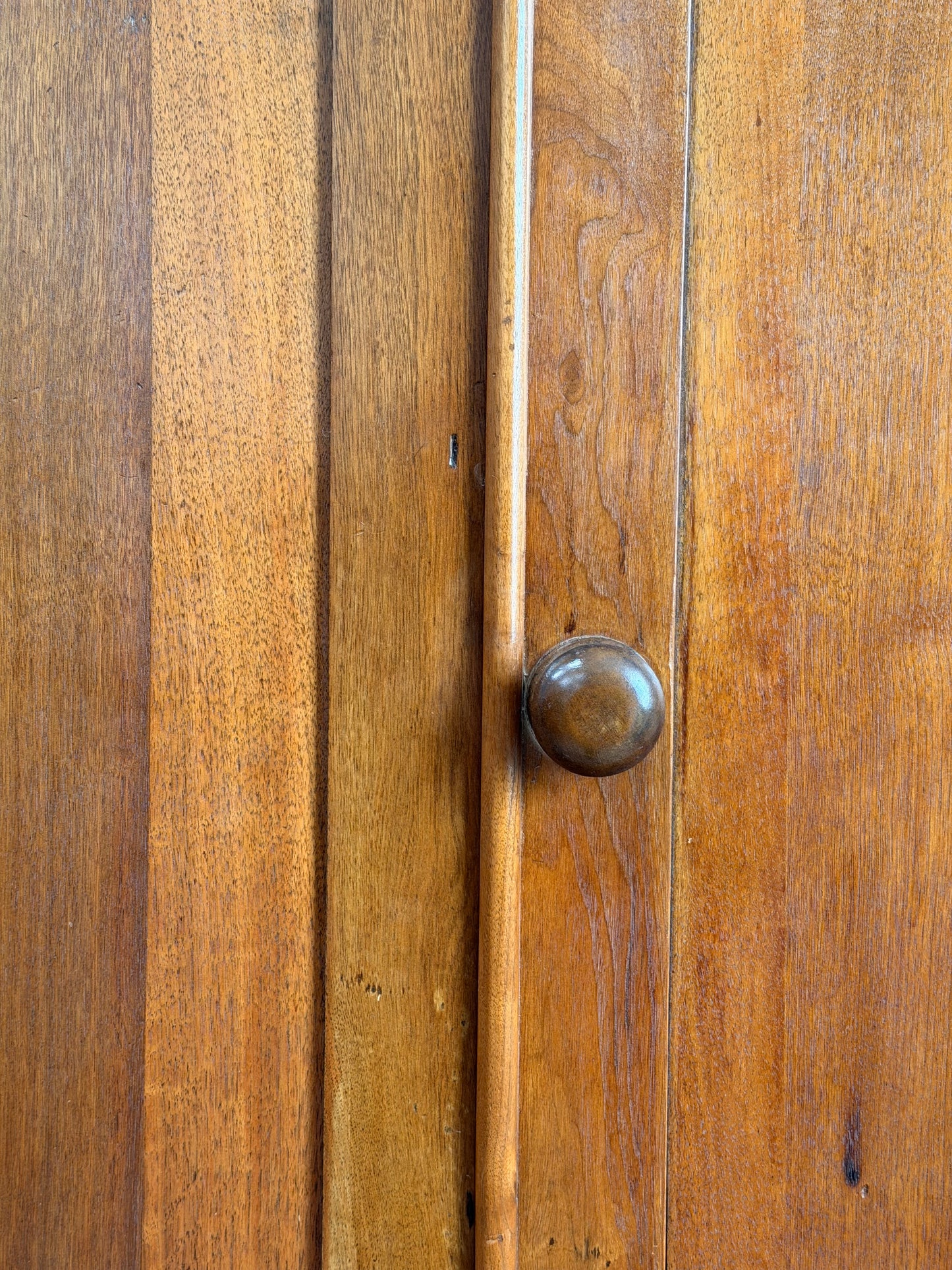 A ca. 1840 one-piece country set back cupboard with a butternut front and pine sides, the top has two paneled doors with three fixed shelves on the interior, and the bottom has two dovetailed drawers over two paneled doors with a single fixed shelf interior, on ball feet. Very clean. Old animal holes. Really stunning presentation.