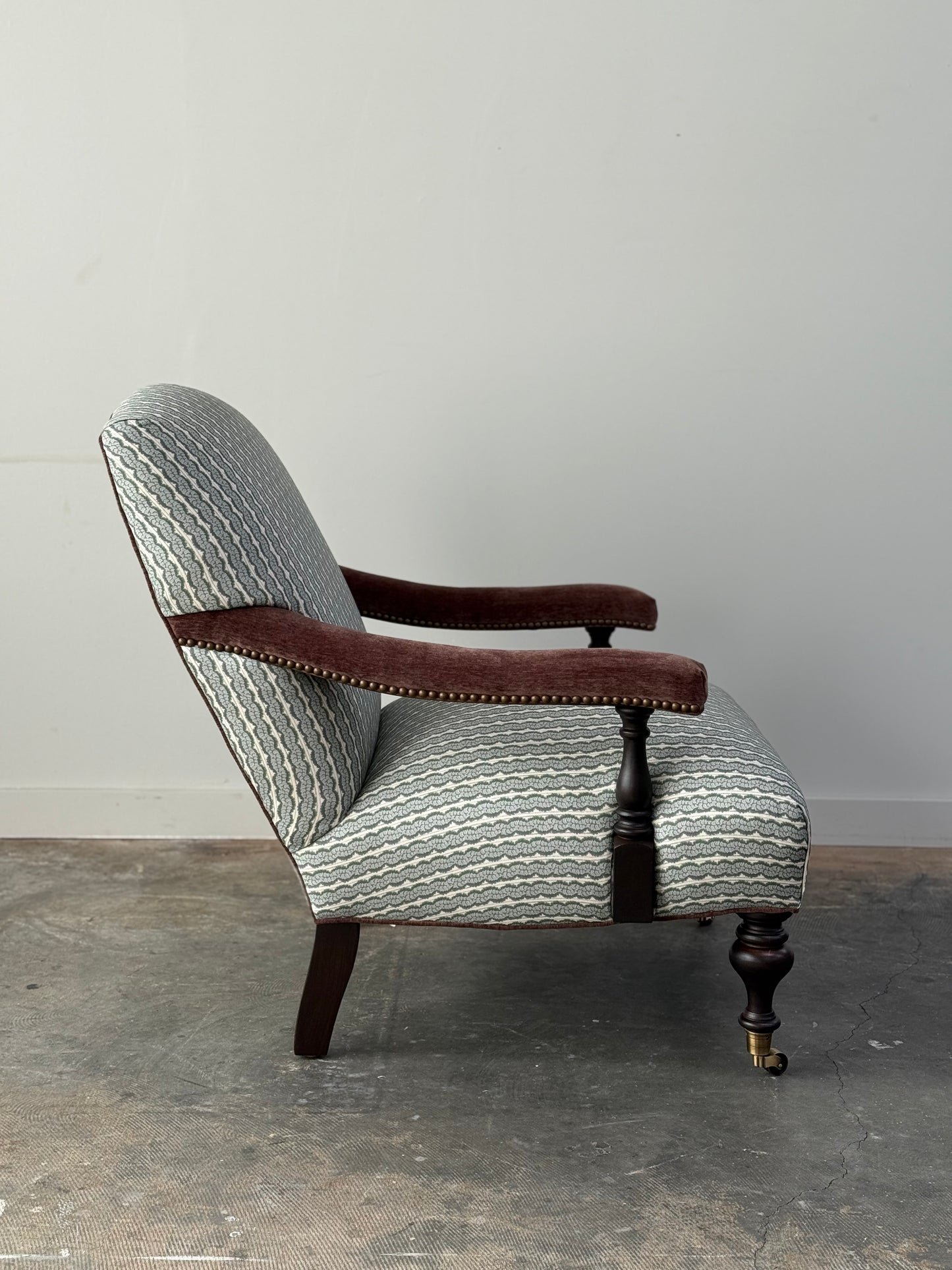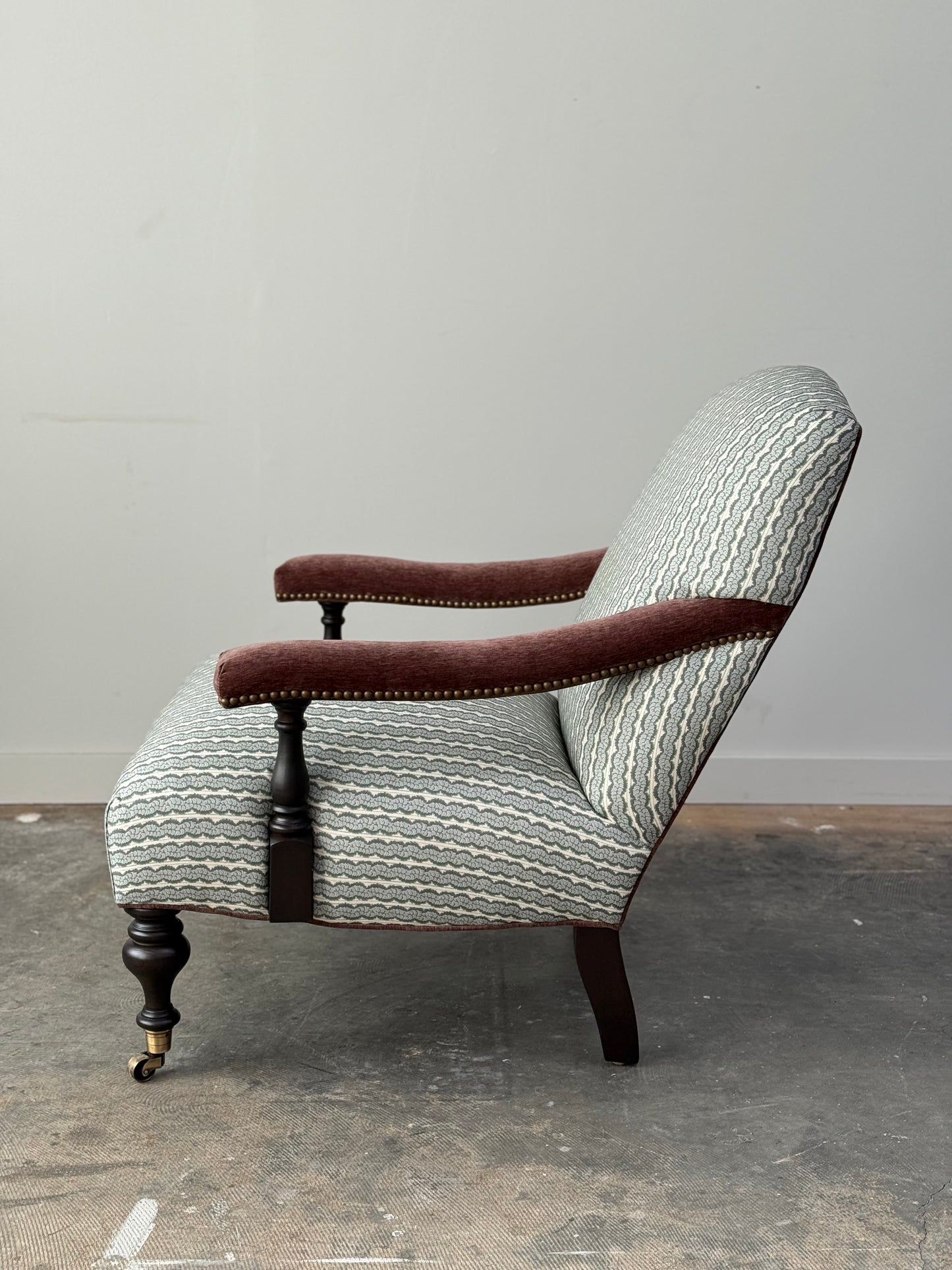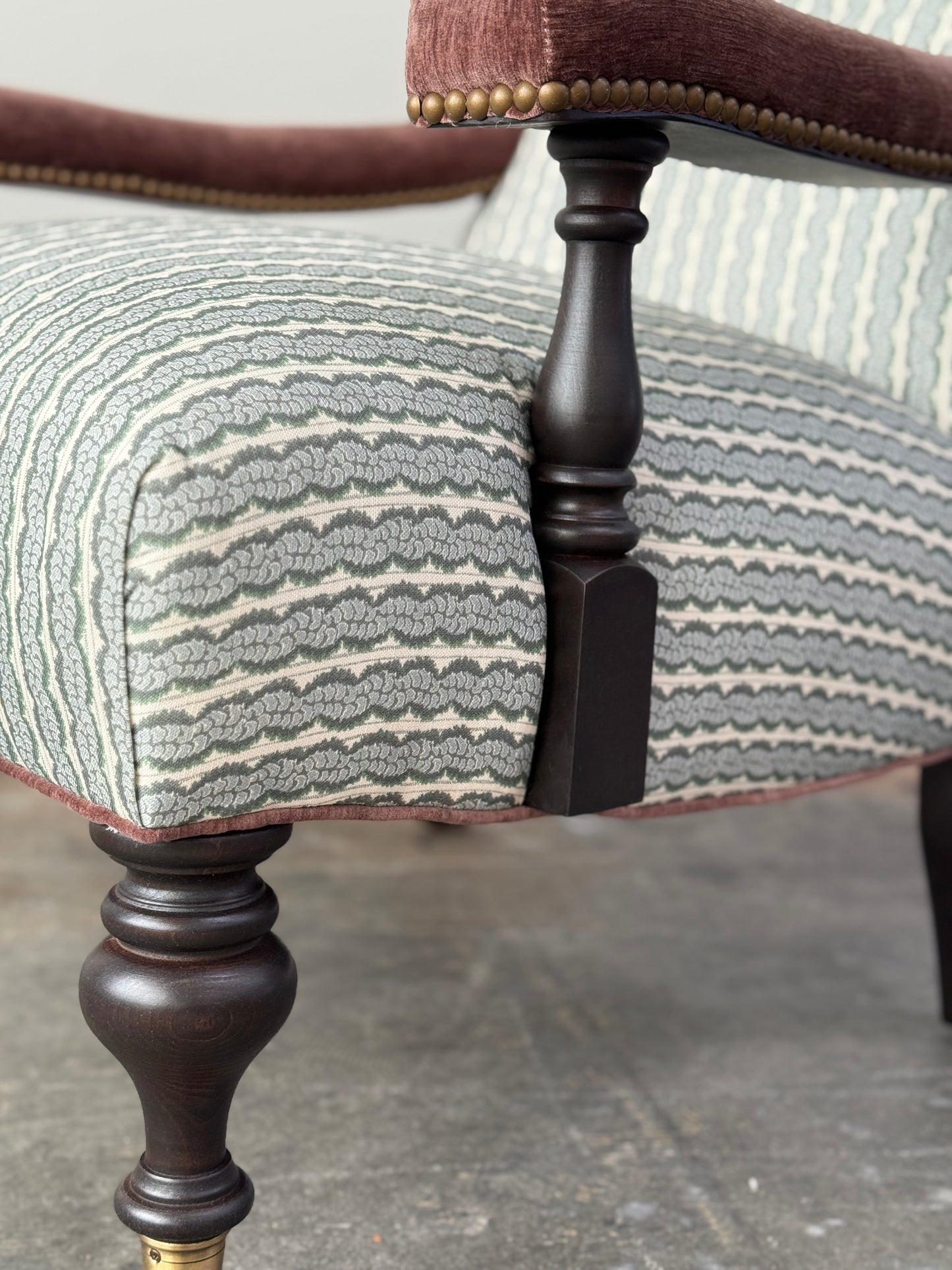 The Adela Library Chair is a stunning classic open arm chair. Such a great accent chair that is as comfortable as it is beautiful. Can be made in many different fabrics and finishes. Also available in a settee and with a cushioned seat instead of a tight seat.
