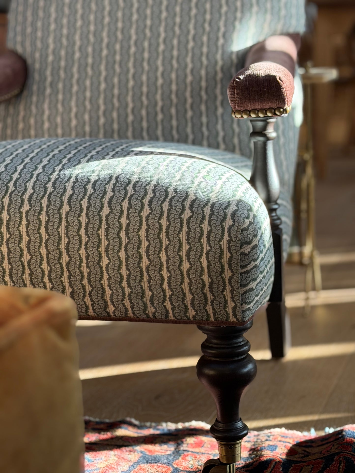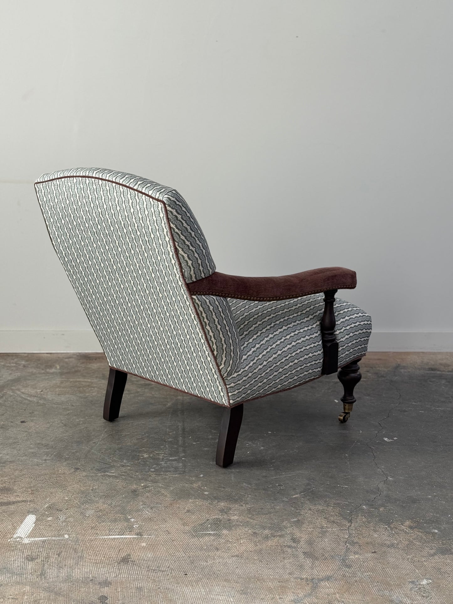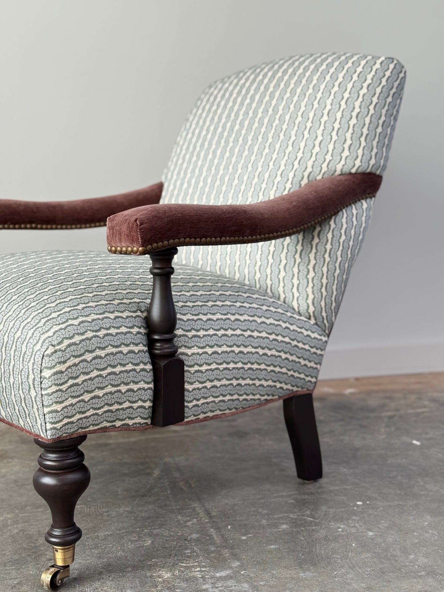 The Adela Library Chair is a stunning classic open arm chair. Such a great accent chair that is as comfortable as it is beautiful. Can be made in many different fabrics and finishes. Also available in a settee and with a cushioned seat instead of a tight seat.