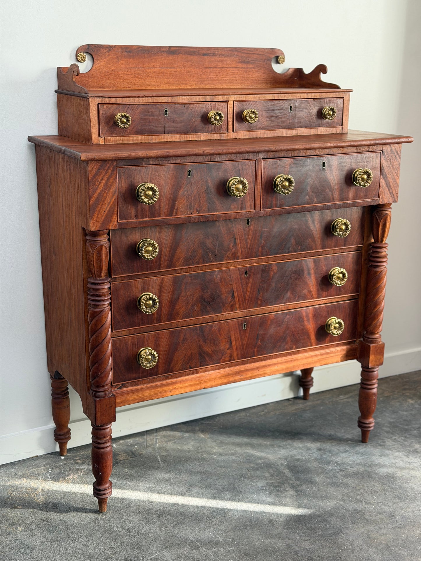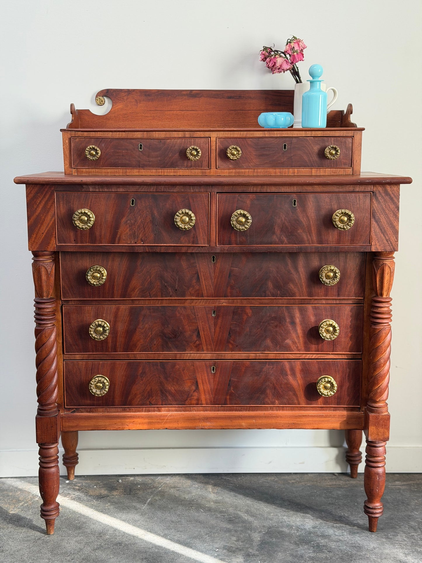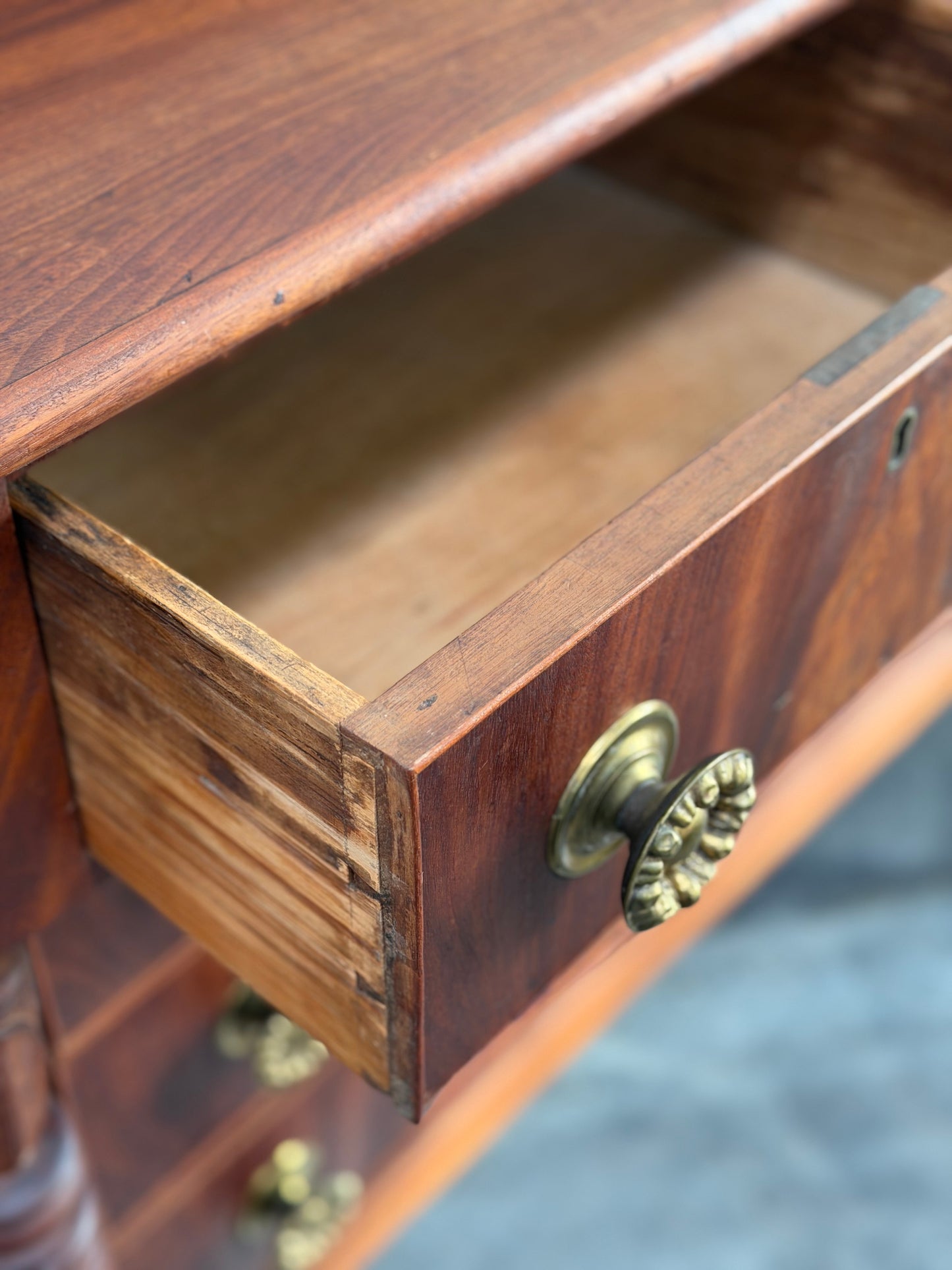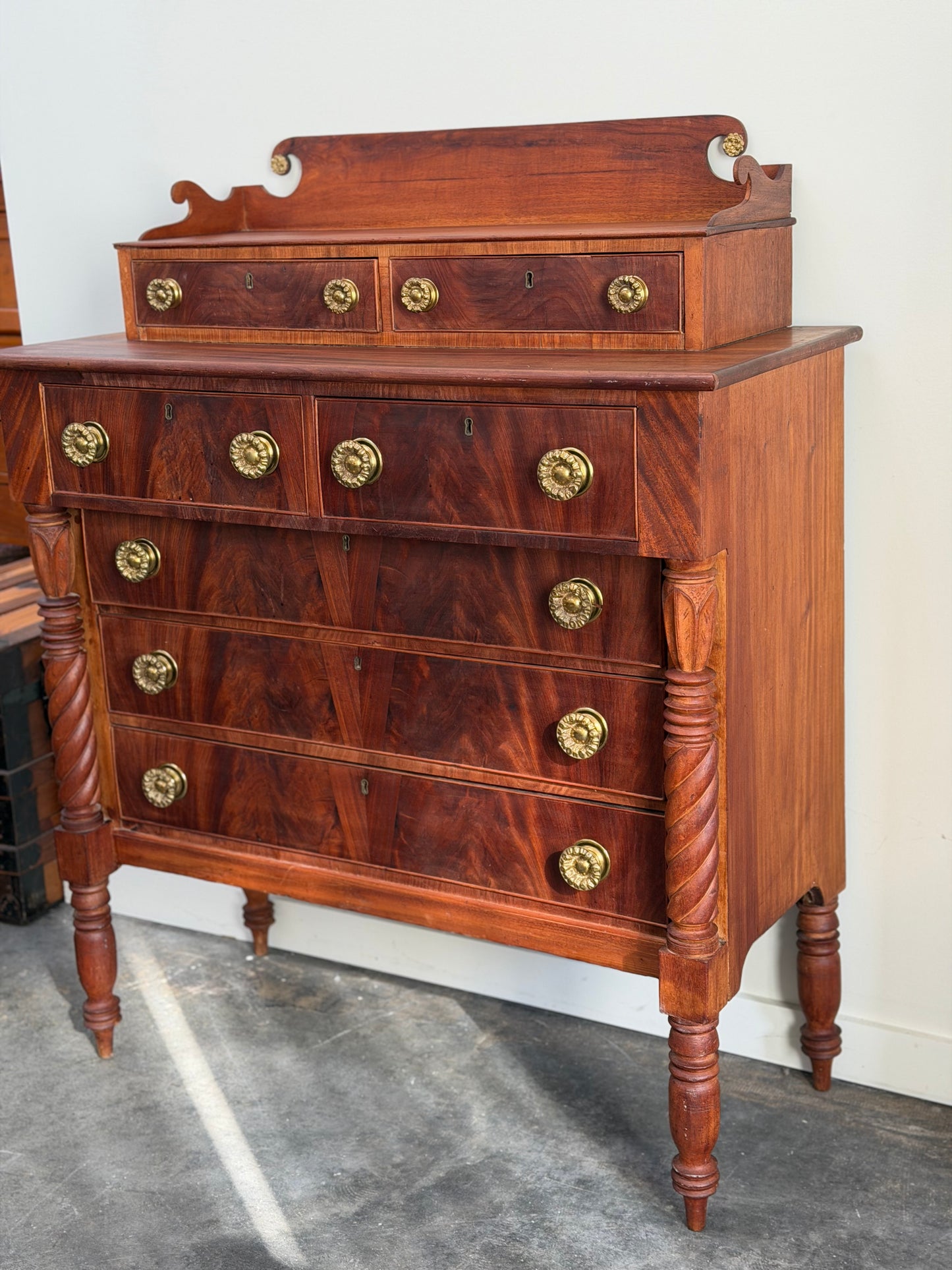 Beautifully carved chest of drawers has impressive two drawer top compartment with carved backsplash borders. It’s barely twist column supports are in excellent condition. Has a great color and character. Brass accents. So lovely.