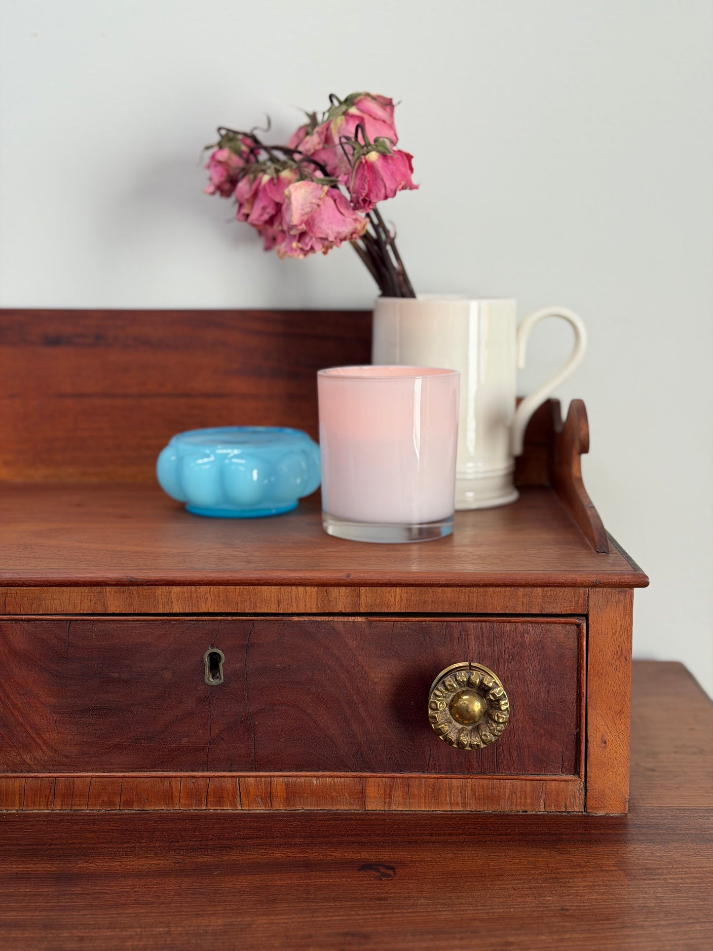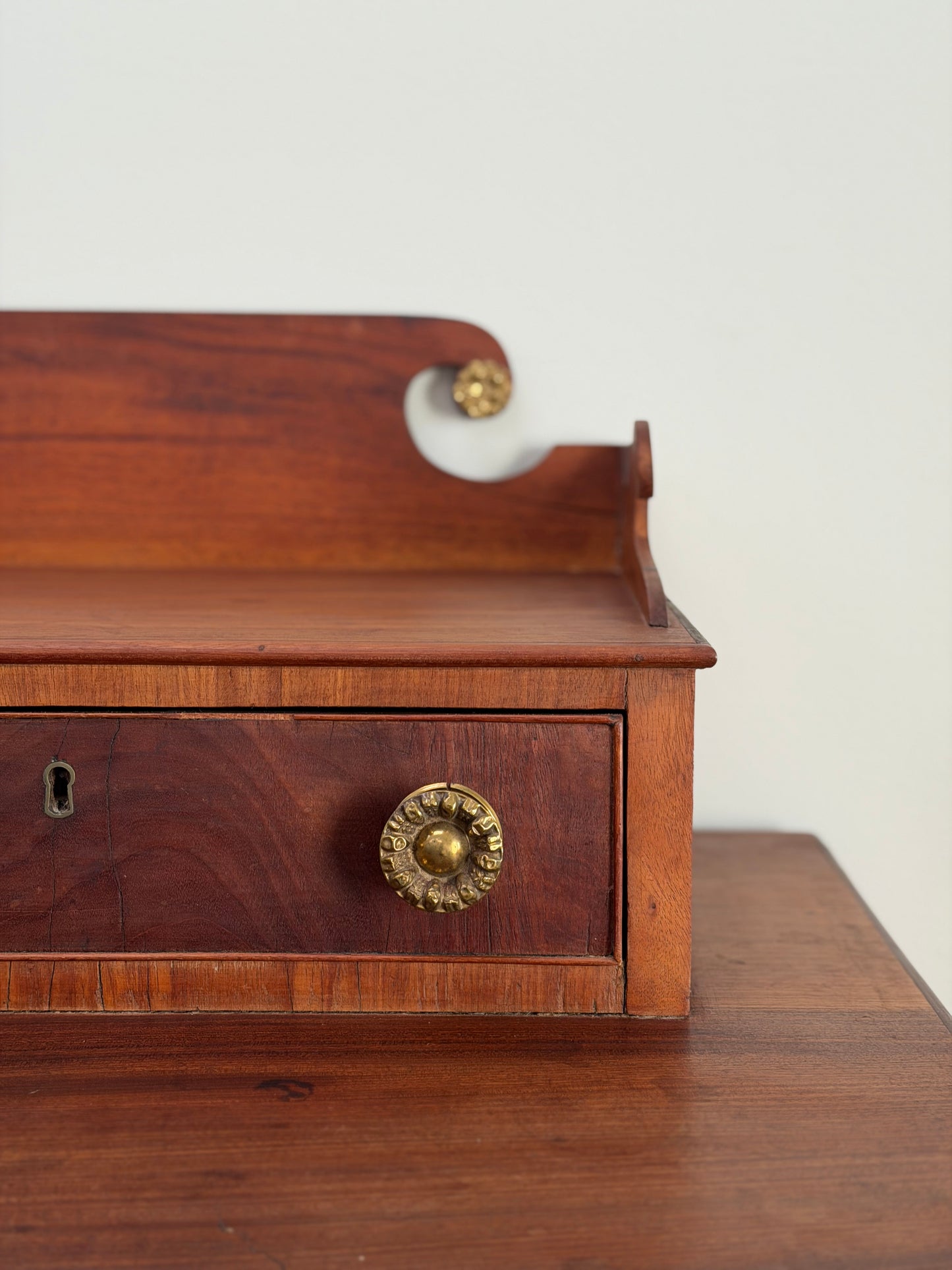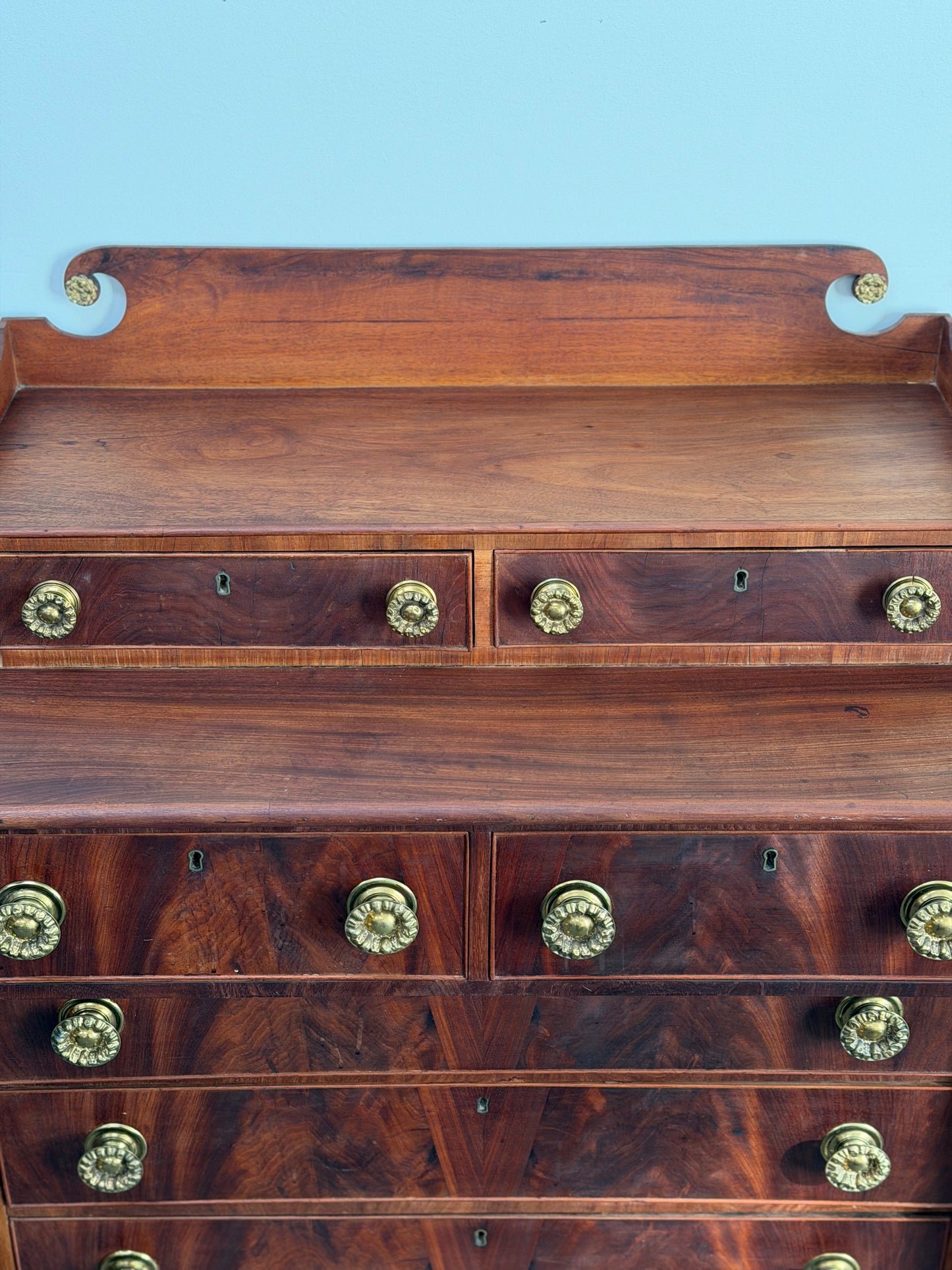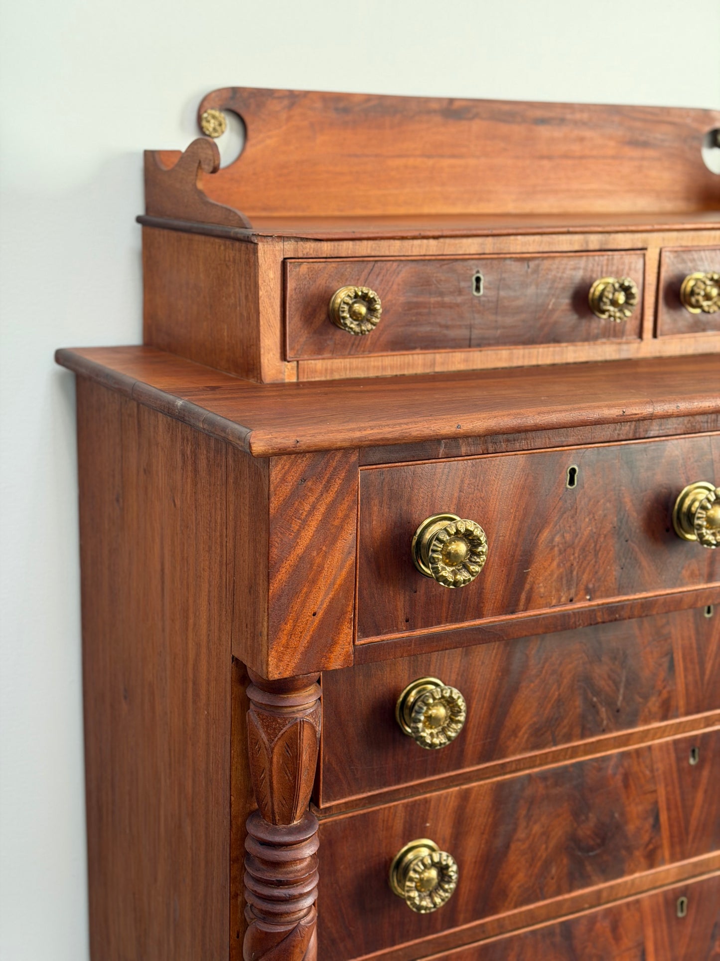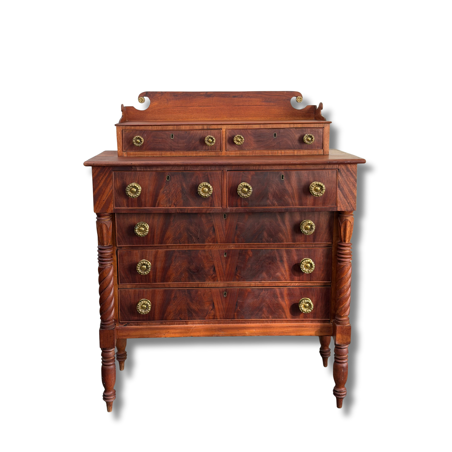 Beautifully carved chest of drawers has impressive two drawer top compartment with carved backsplash borders. It’s barely twist column supports are in excellent condition. Has a great color and character. Brass accents. So lovely.
