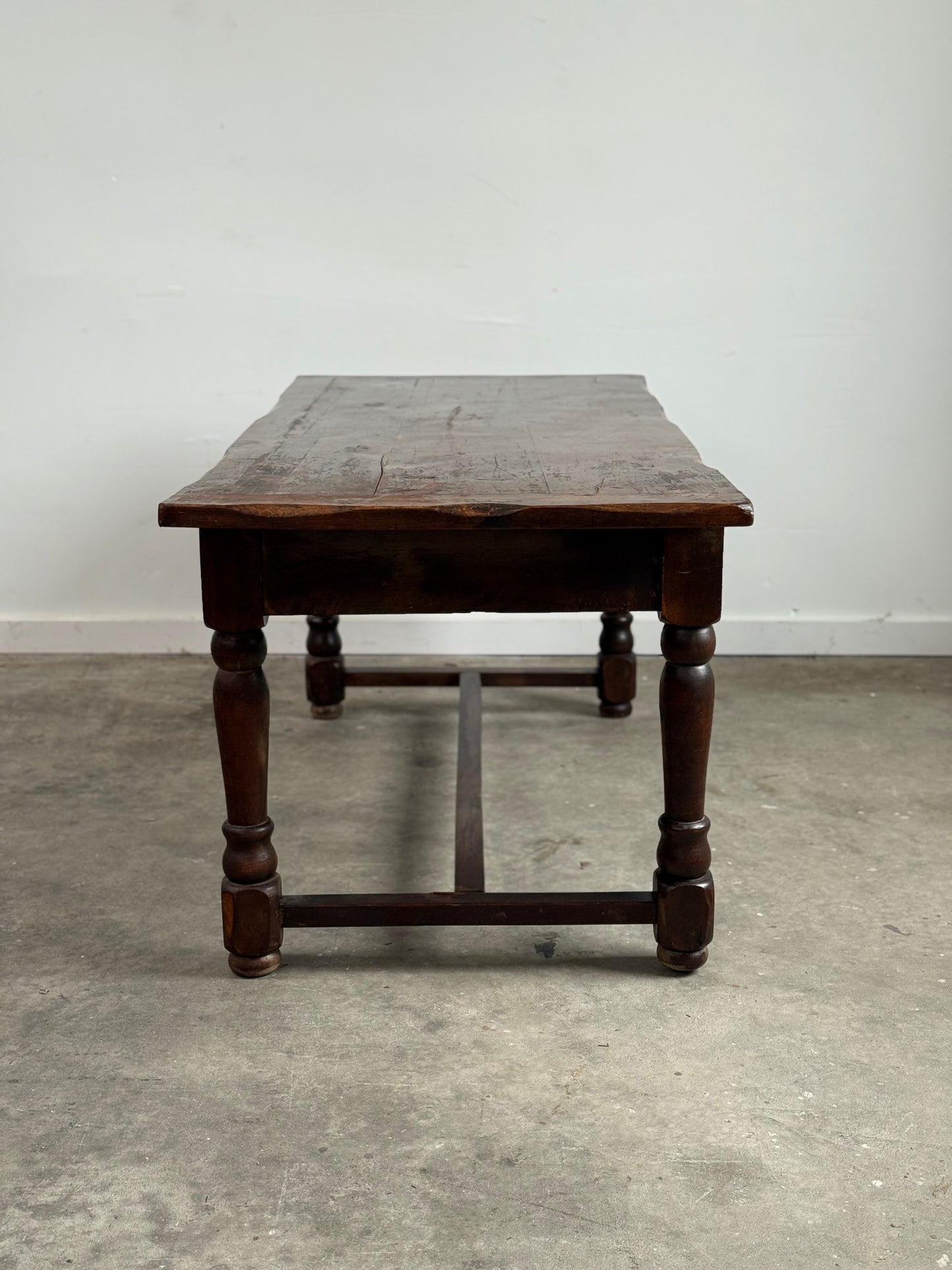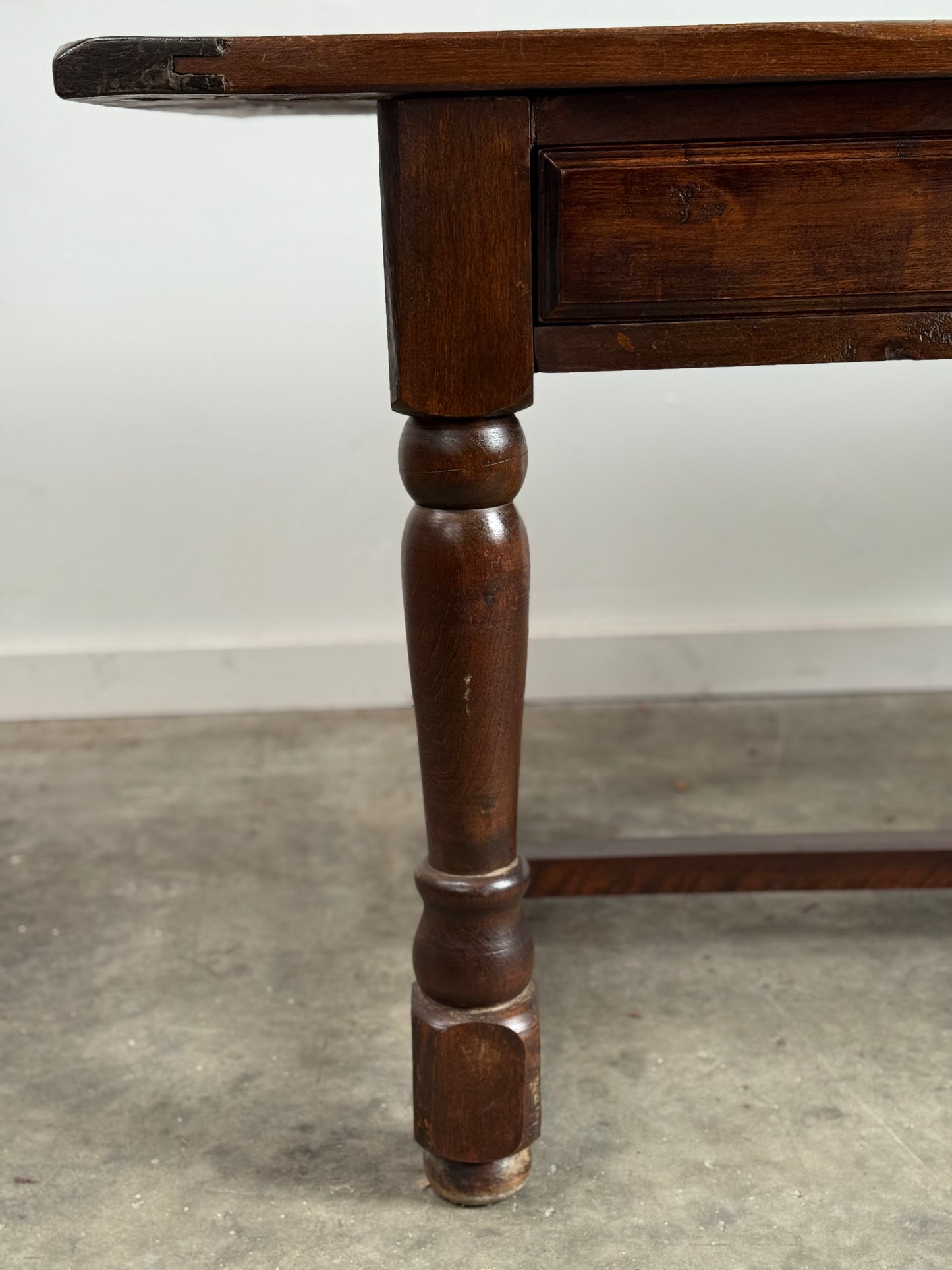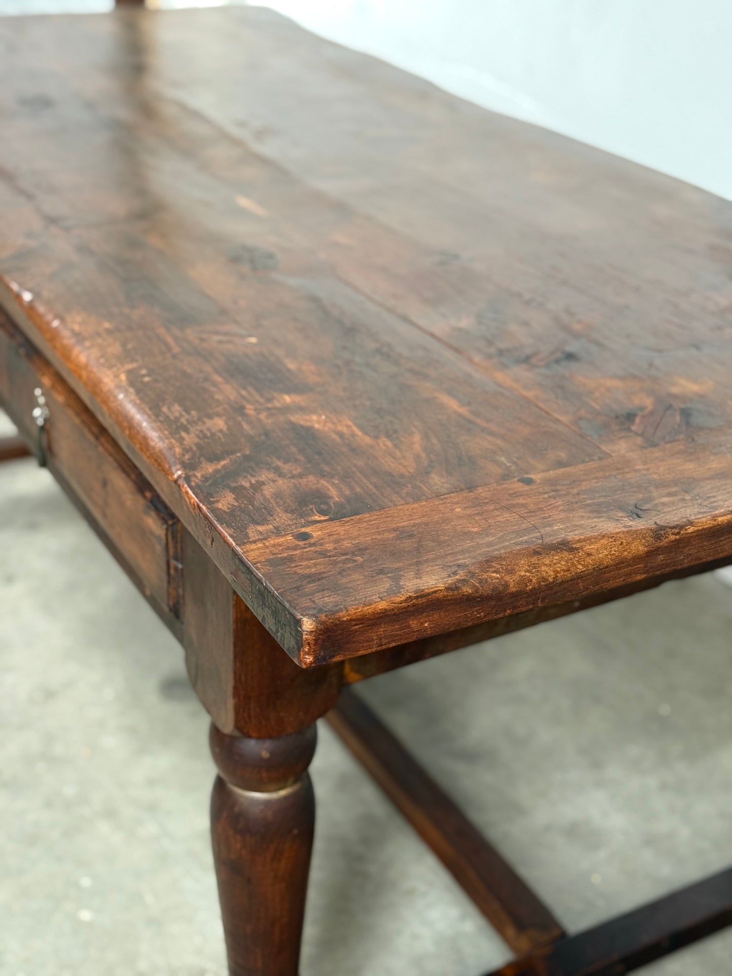 This charming 19th-century French farmhouse table. Featuring carved legs and a sturdy stretcher base, it showcases authentic period craftsmanship. Two practical drawers offer convenient storage, while the rich dark finish adds warmth and character. A beautiful piece.