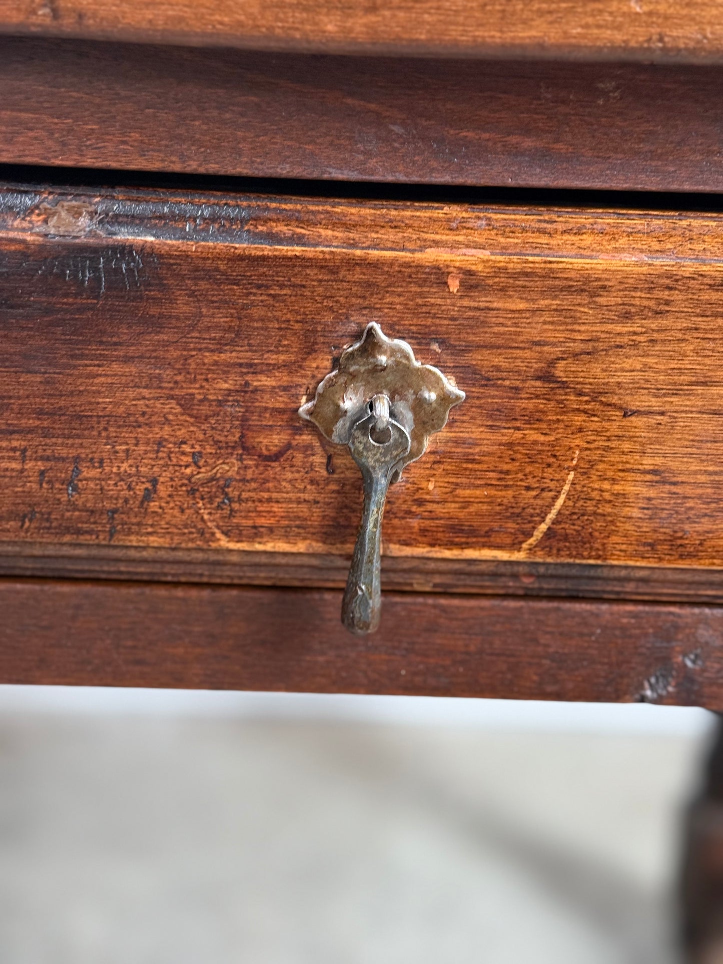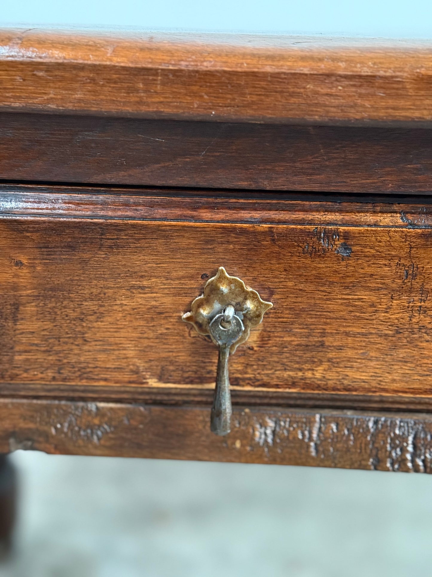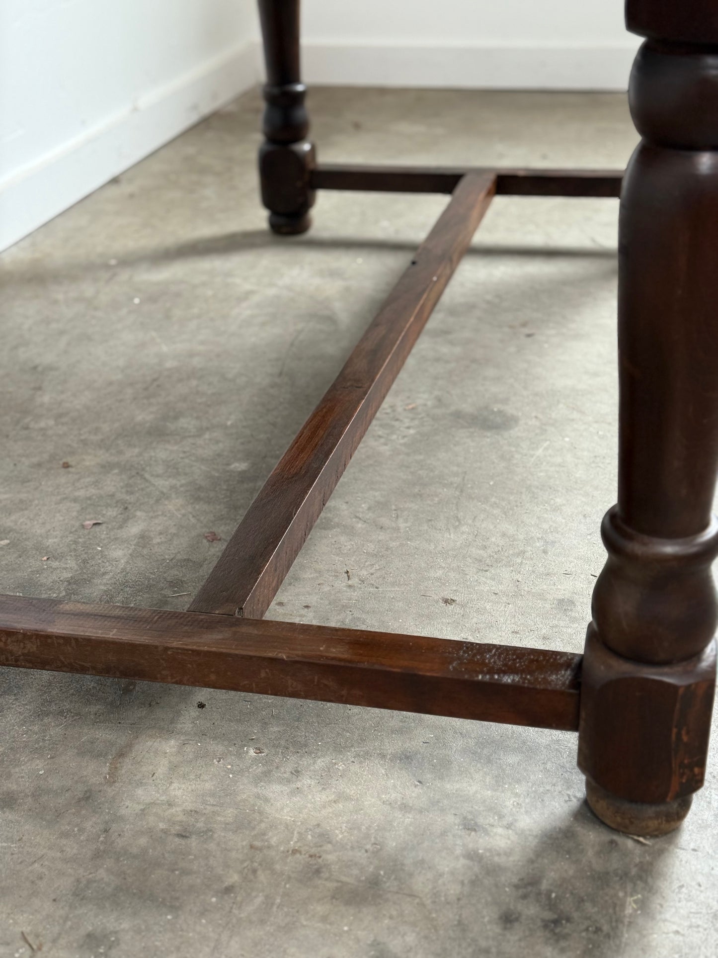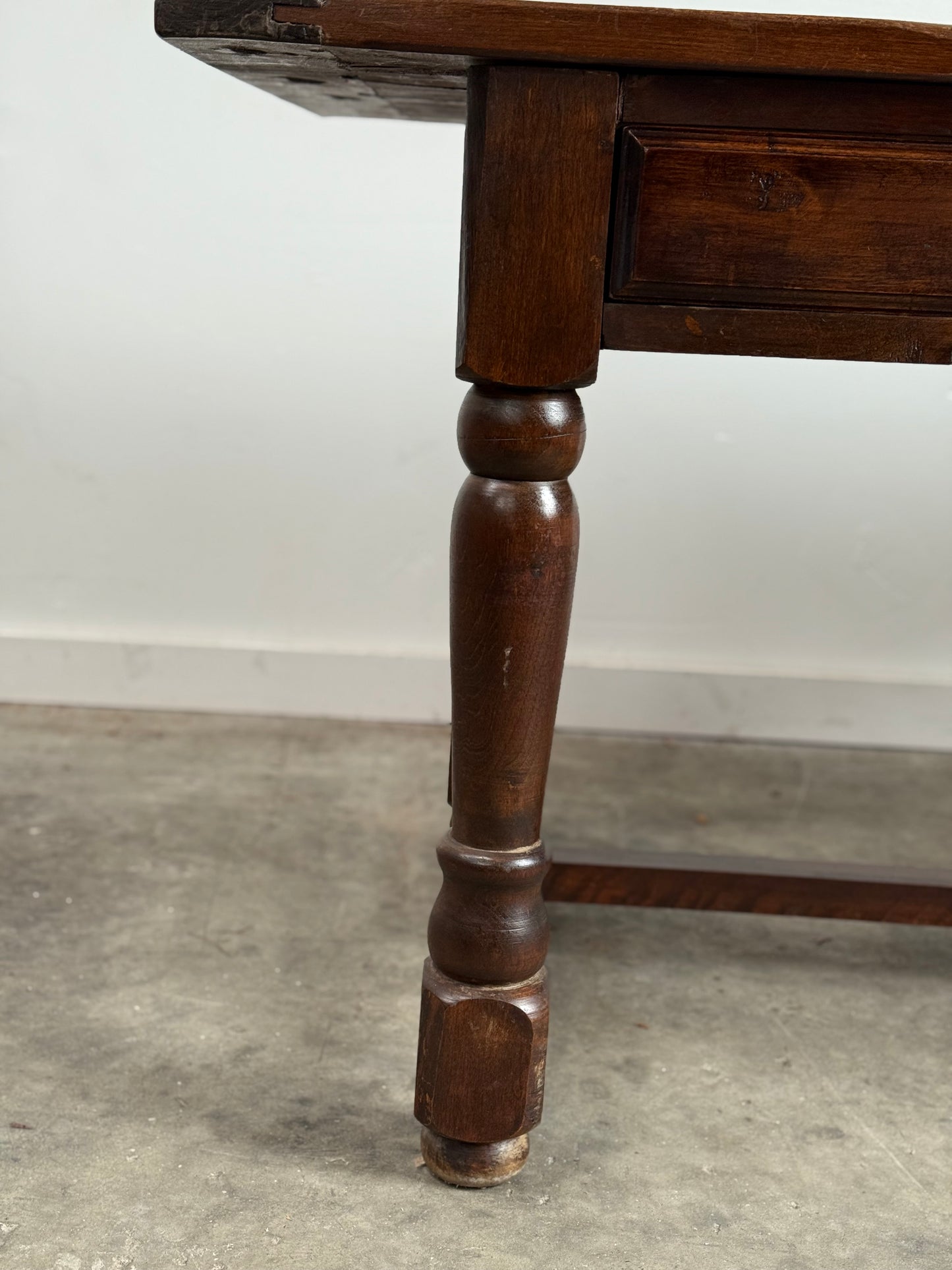 This charming 19th-century French farmhouse table. Featuring carved legs and a sturdy stretcher base, it showcases authentic period craftsmanship. Two practical drawers offer convenient storage, while the rich dark finish adds warmth and character. A beautiful piece.