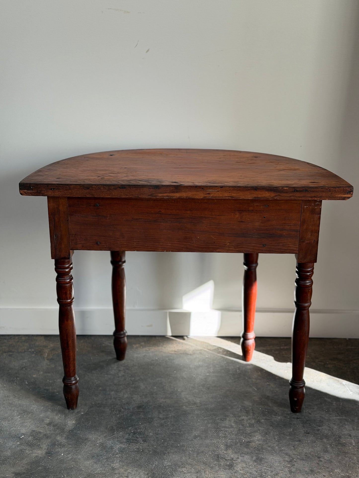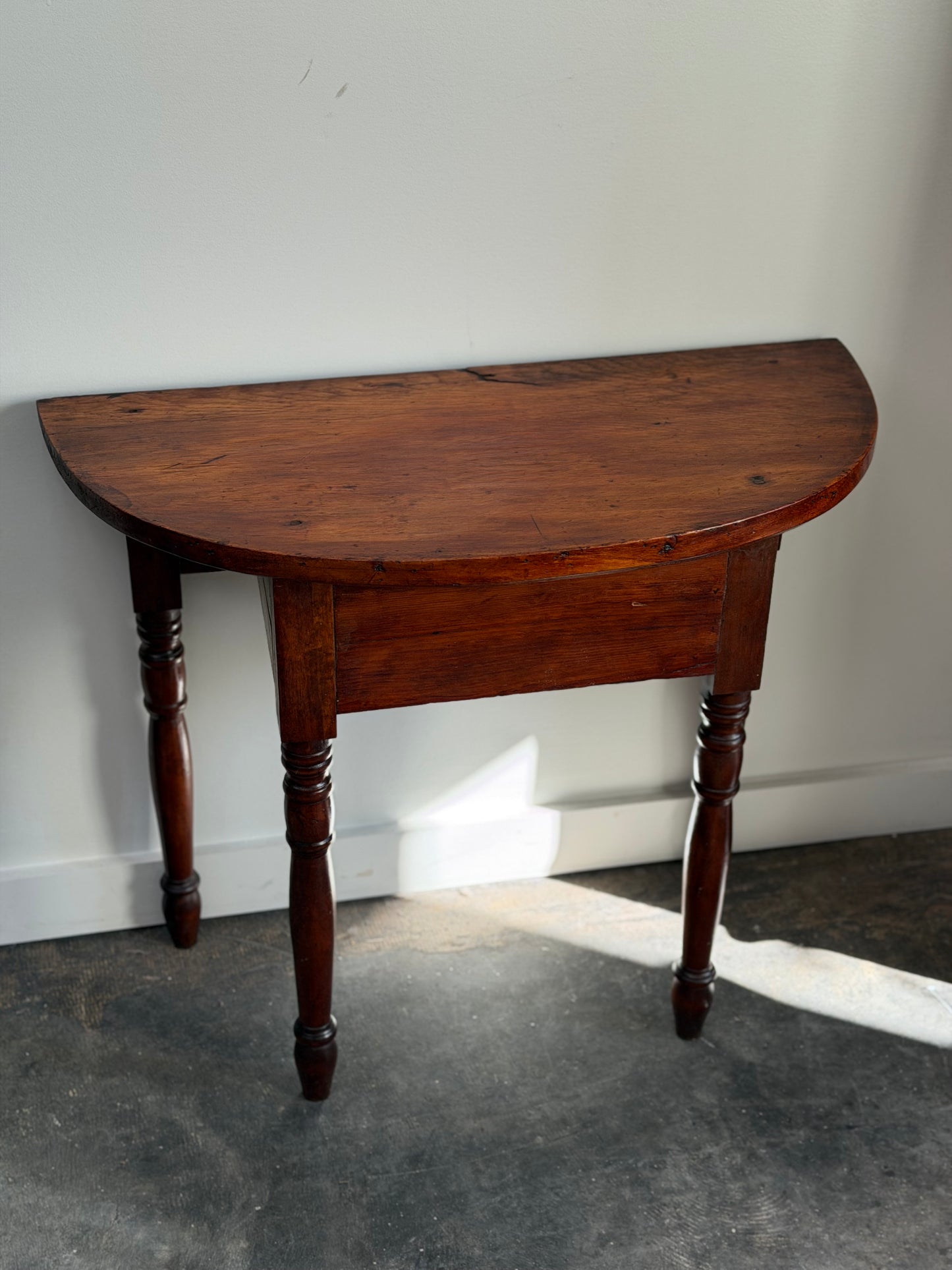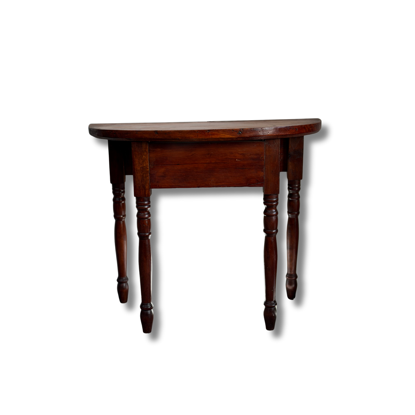 The stand has turned legs with extended back legs to support a half moon top. There're wood pegs and a small crack in the back. Would make an ideal entry table for a tight space.