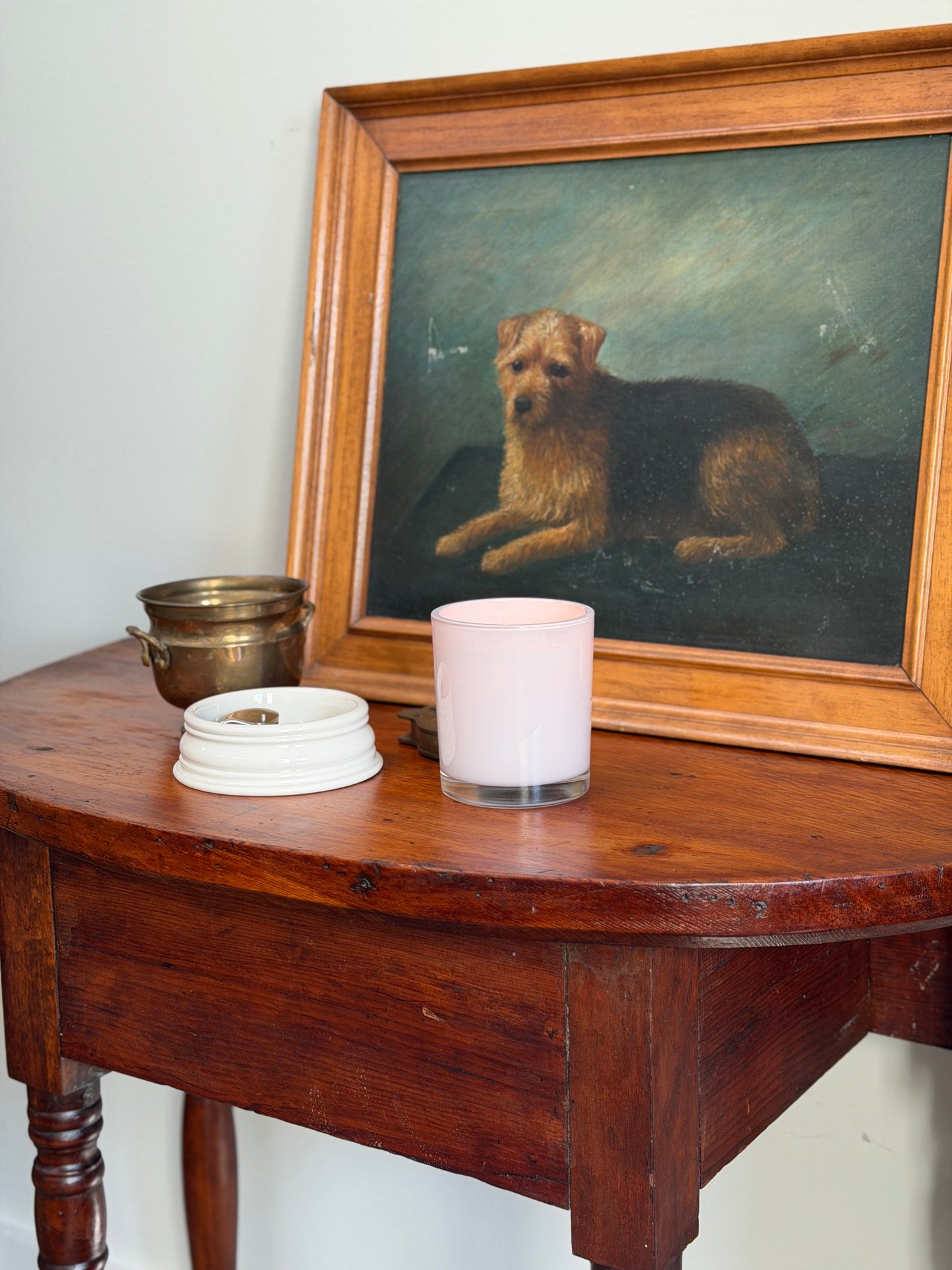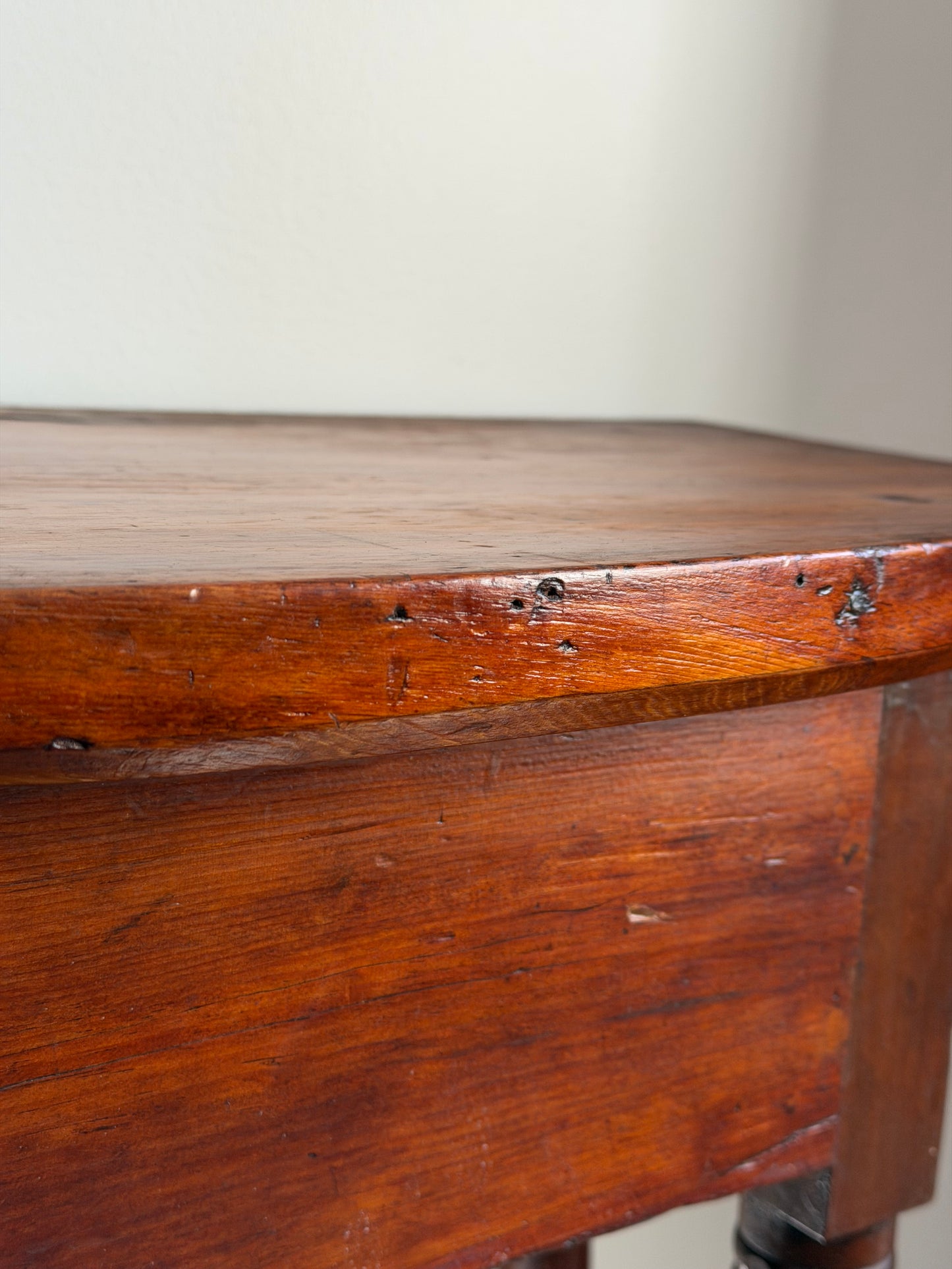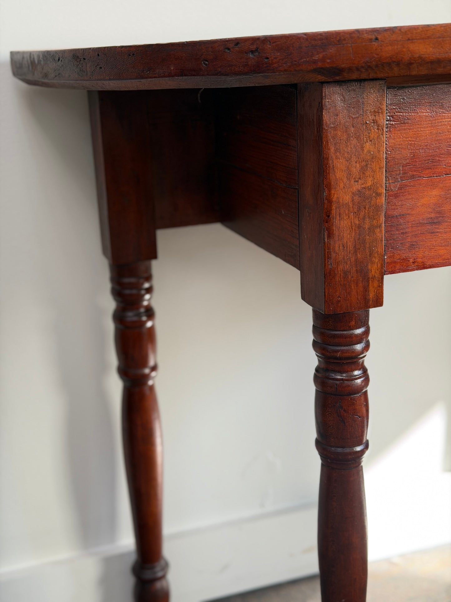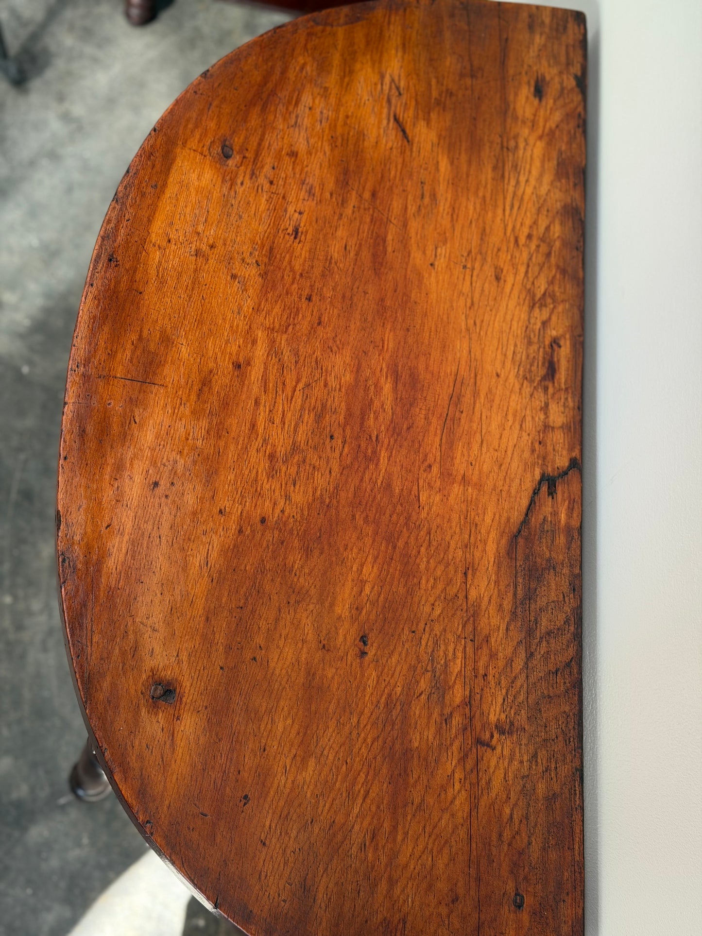 The stand has turned legs with extended back legs to support a half moon top. There're wood pegs and a small crack in the back. Would make an ideal entry table for a tight space.