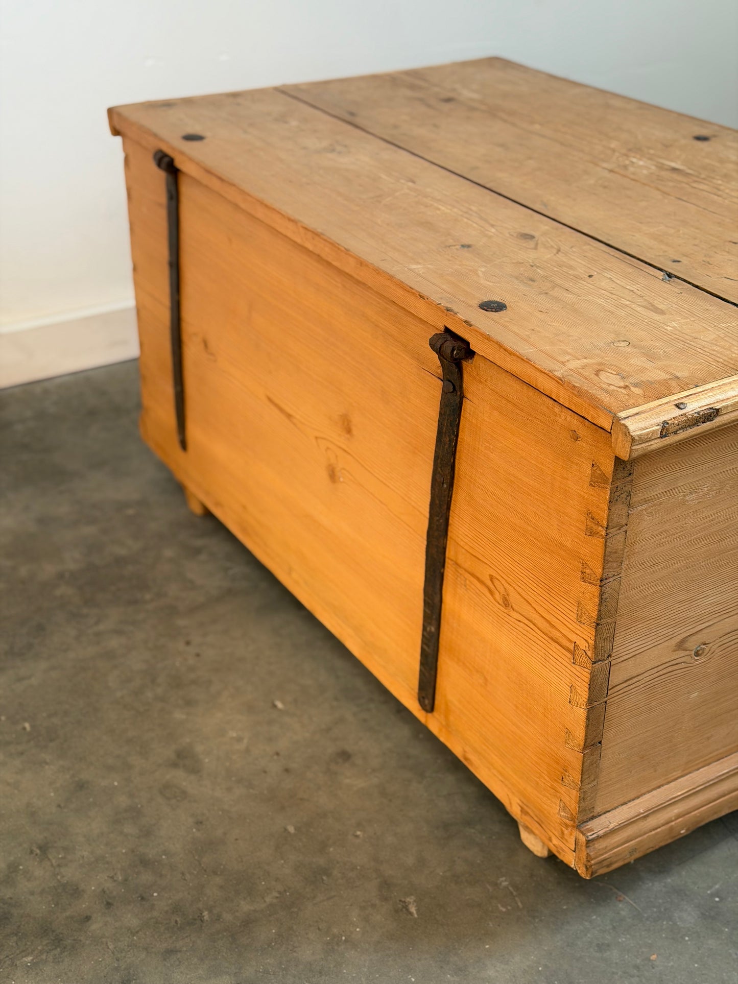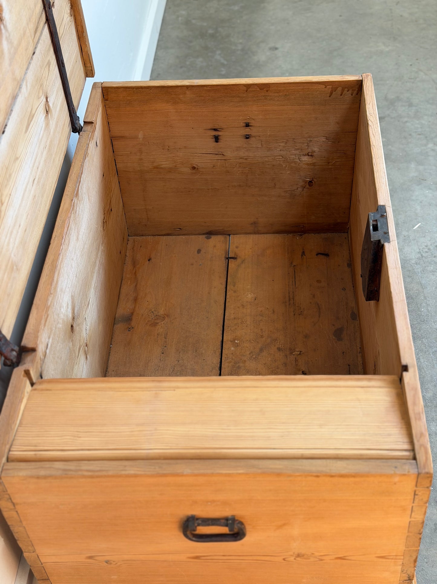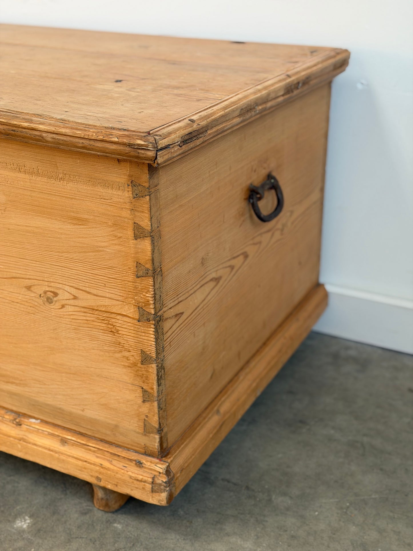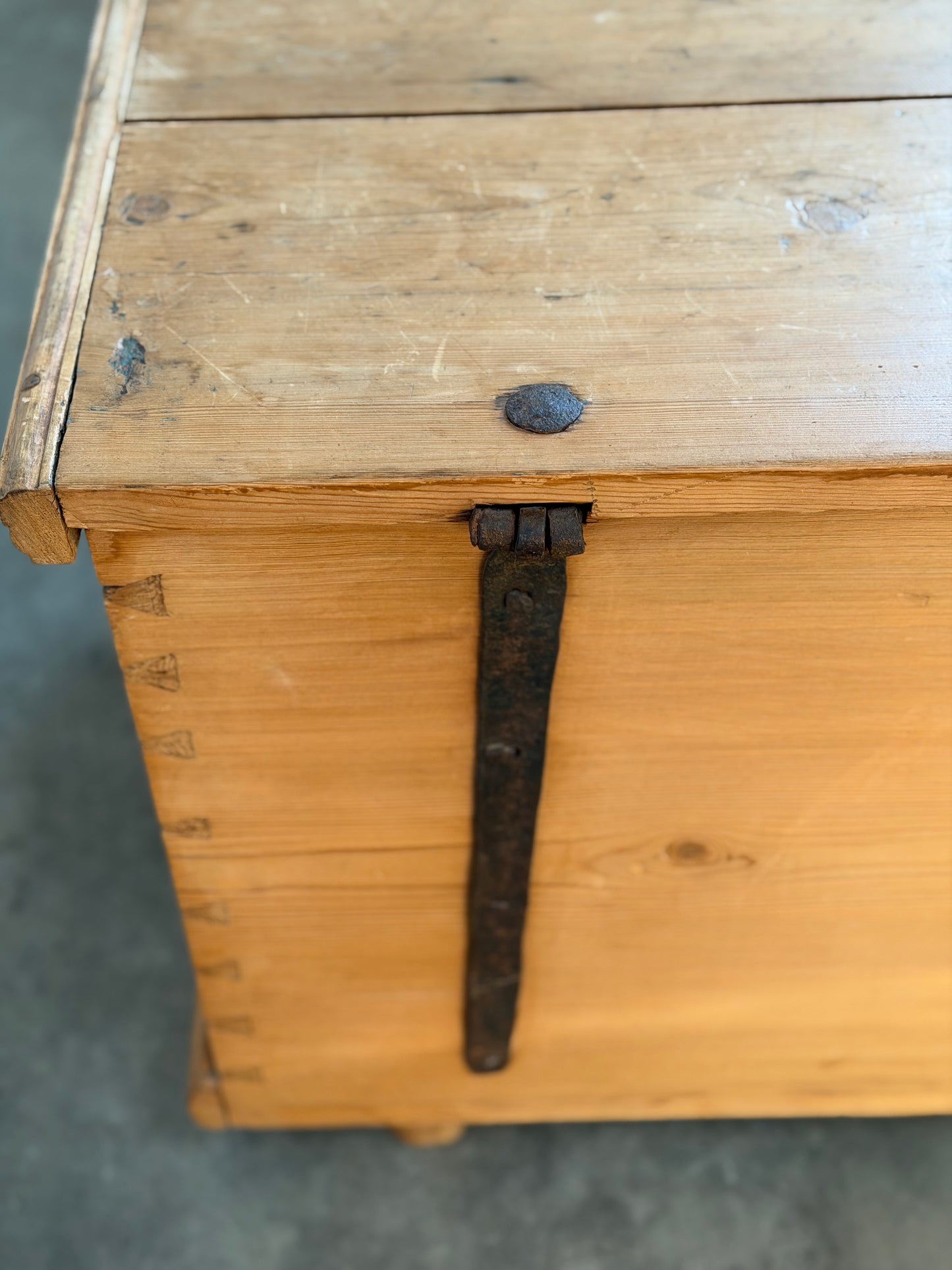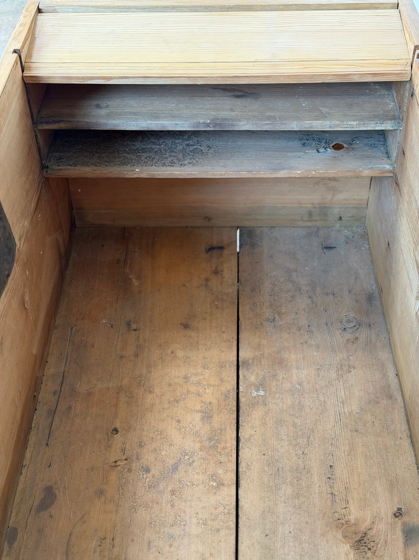 Beautiful Antique Pine Blanket Chest. English. Great exposed joinery. Iron details and fitted with shelves. Early 1800's