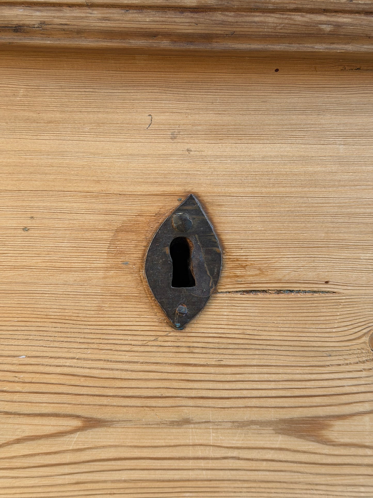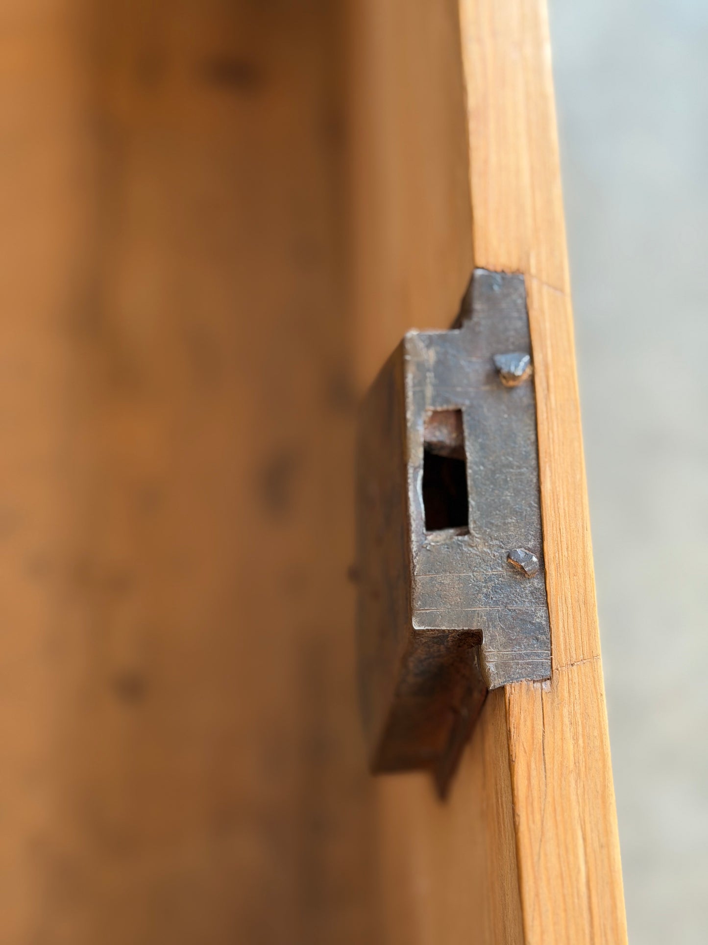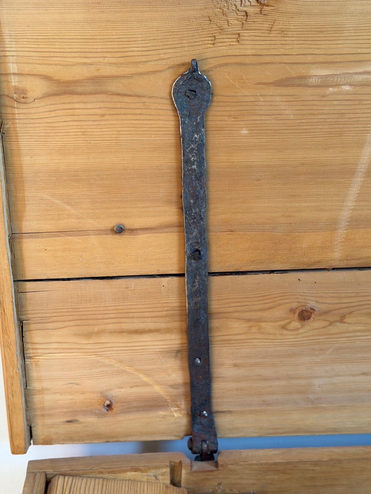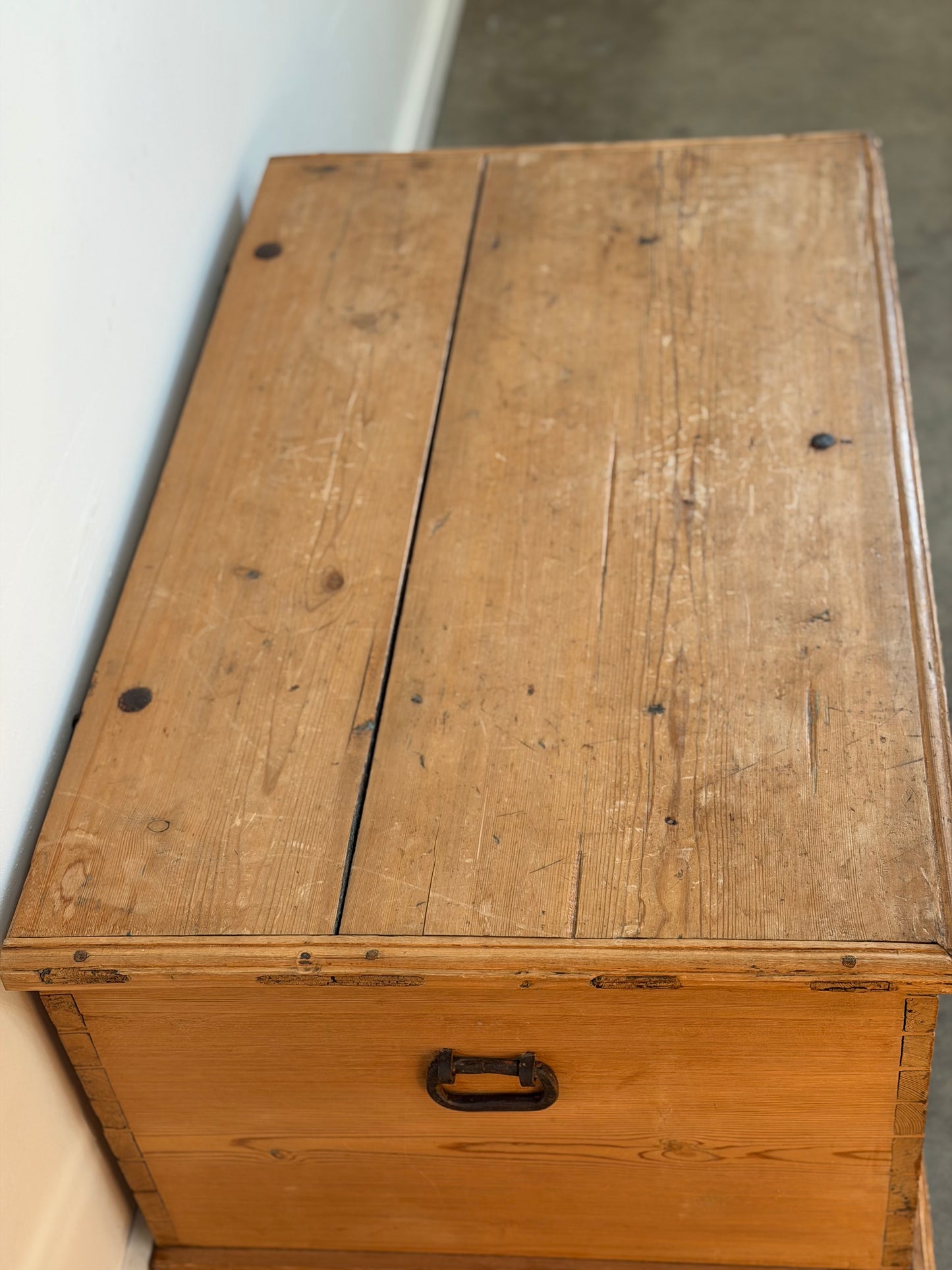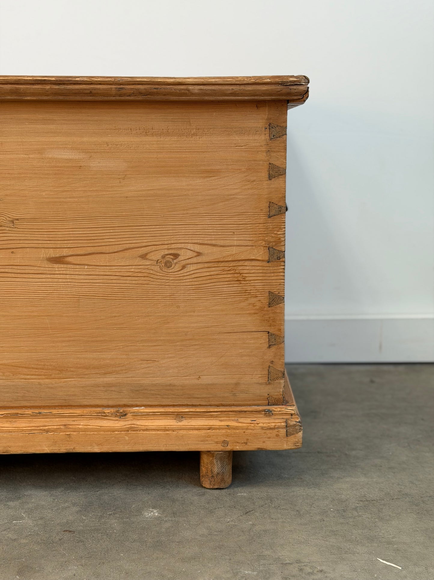 Beautiful Antique Pine Blanket Chest. English. Great exposed joinery. Iron details and fitted with shelves. Early 1800's