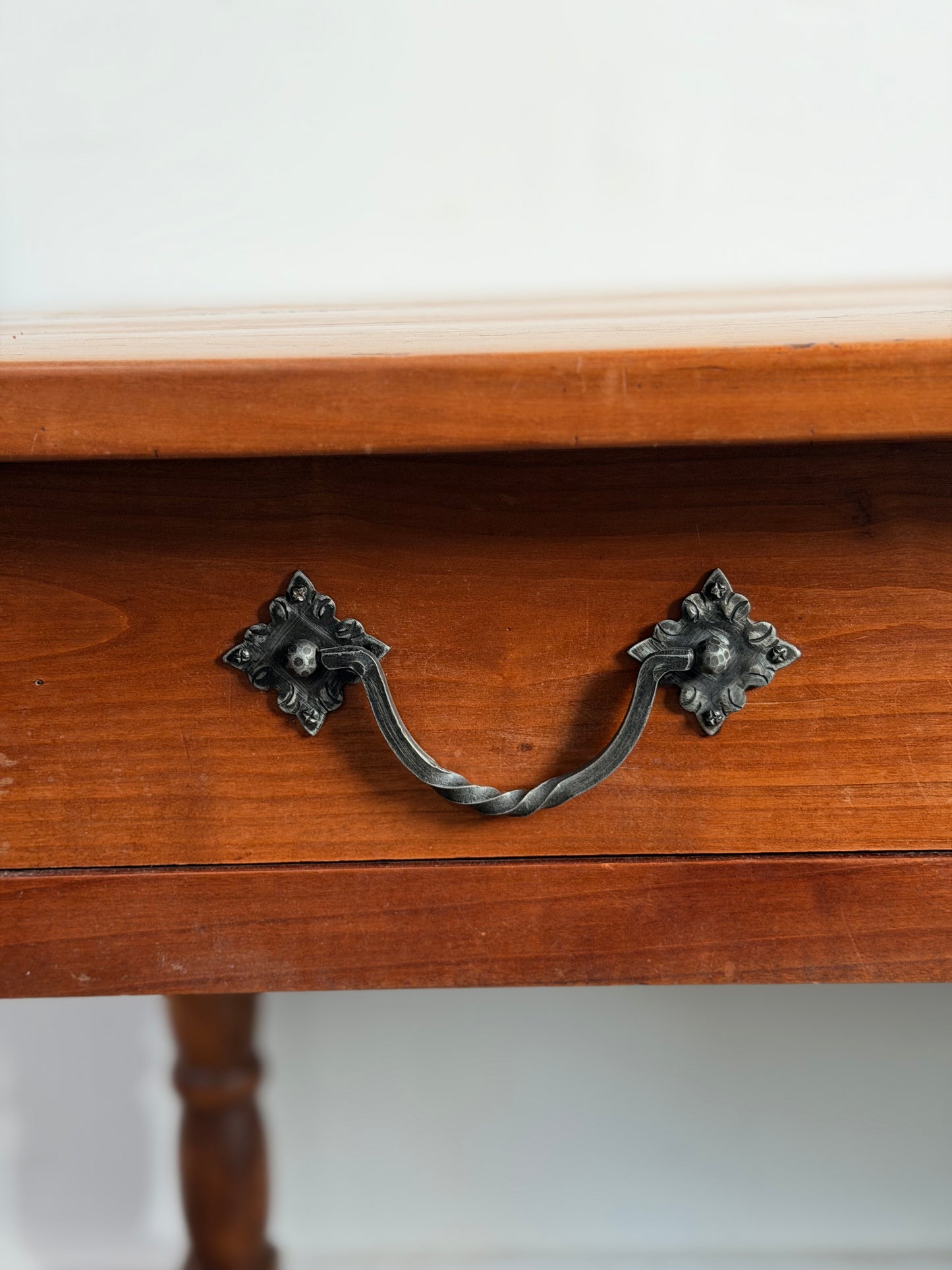 Gorgeous French Farmhouse Table with 3 drawers and 4 turned legs with stretcher. Pewter Hardware. This table is a really great size and could be used in so many ways from dinning or work table to desk or library table.