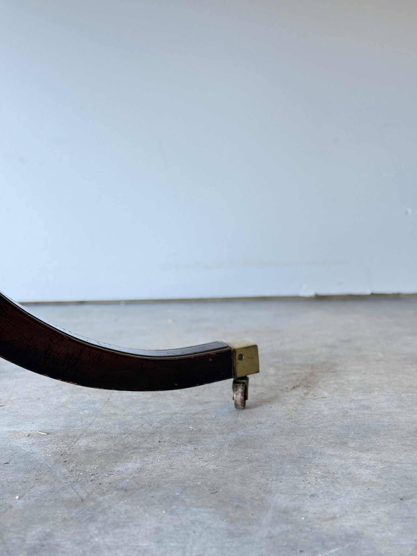 Really nice vintage regency style round dining table. Unusual brass band detail on top is such a highlight of this piece. Great brass castor feet. Overall such a stylish table.
