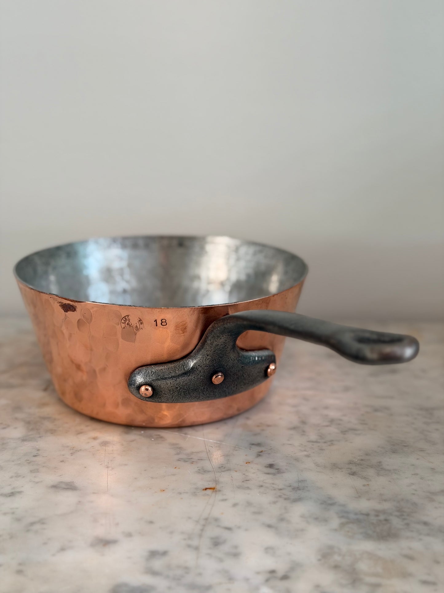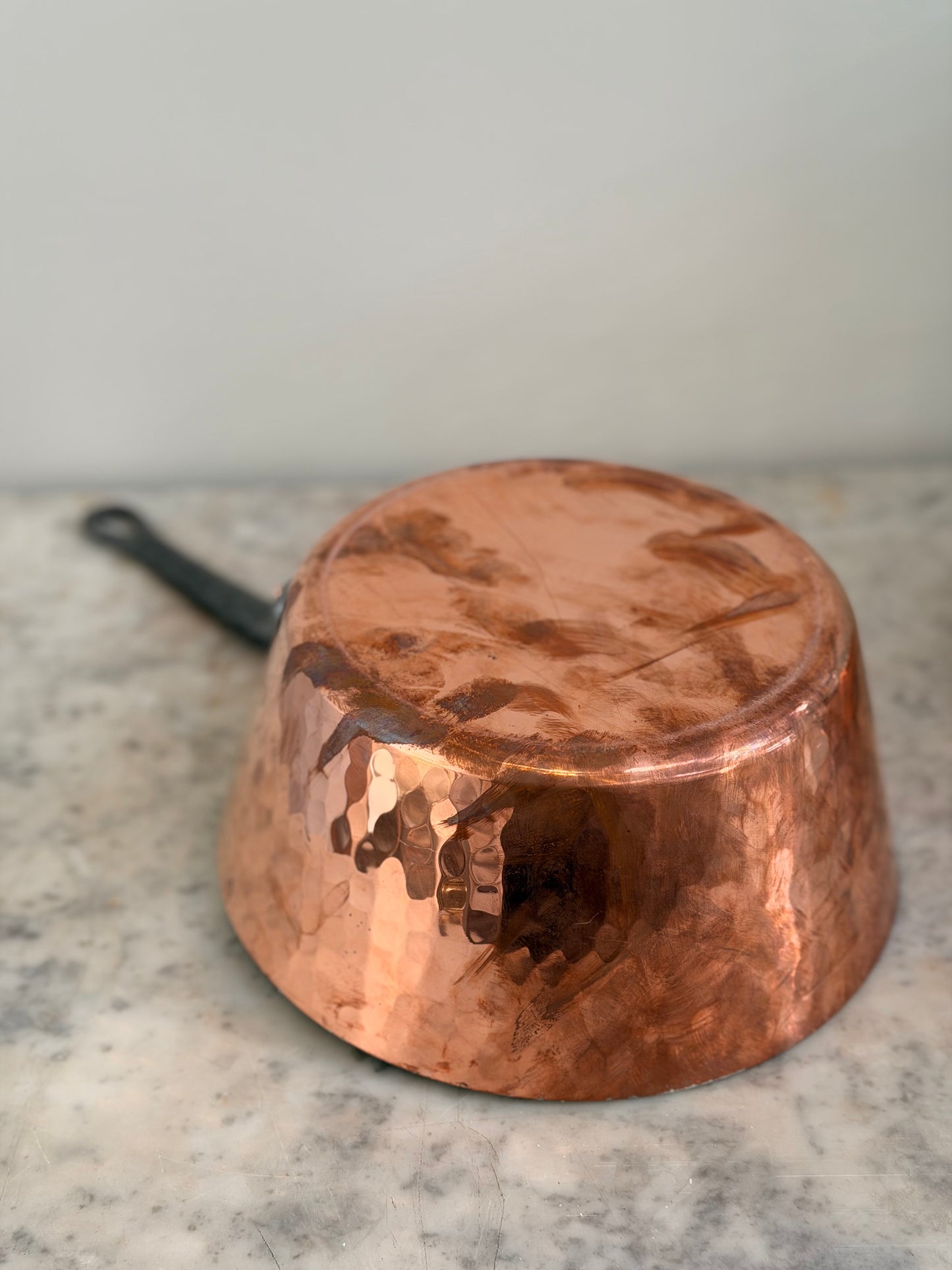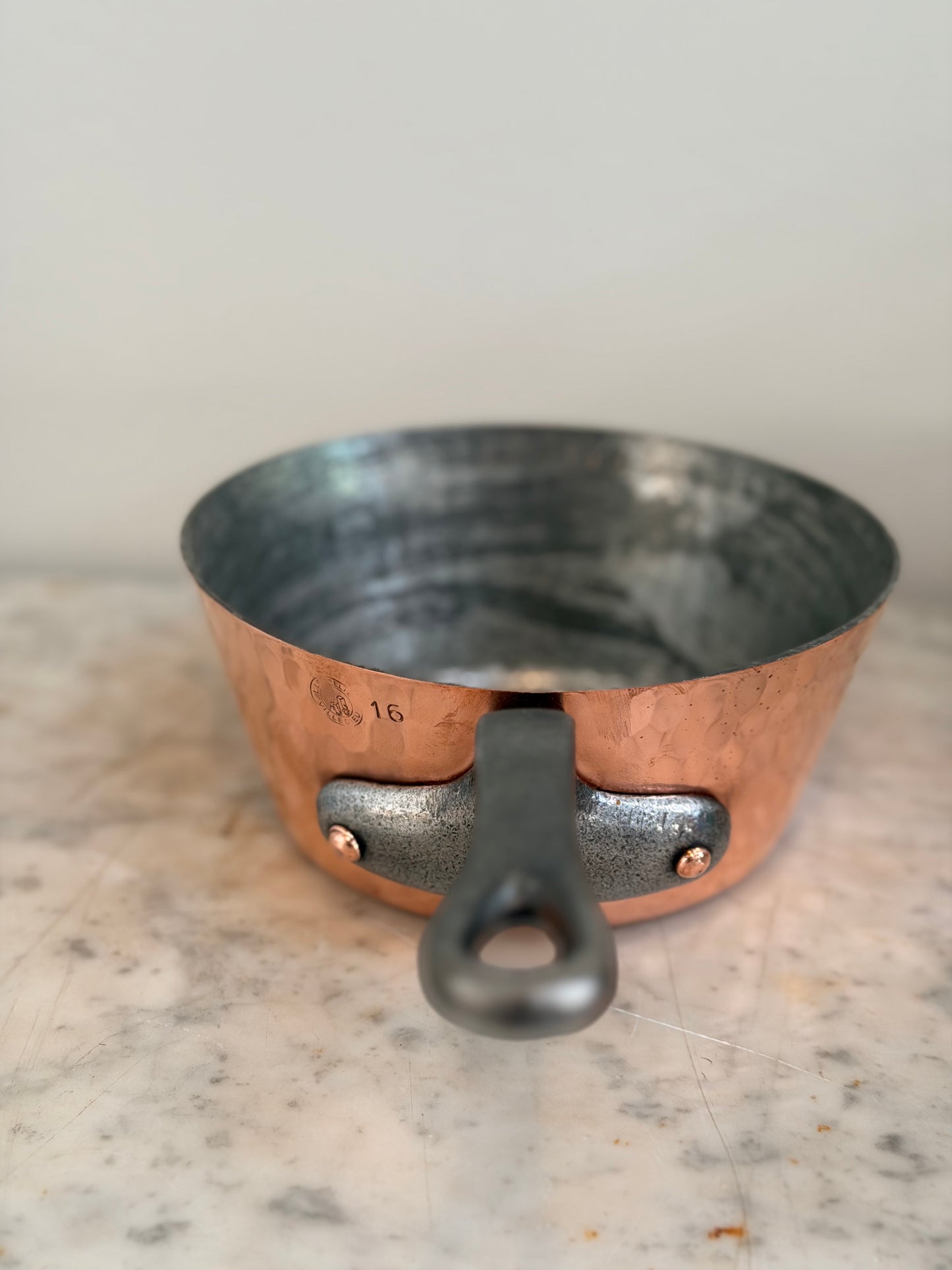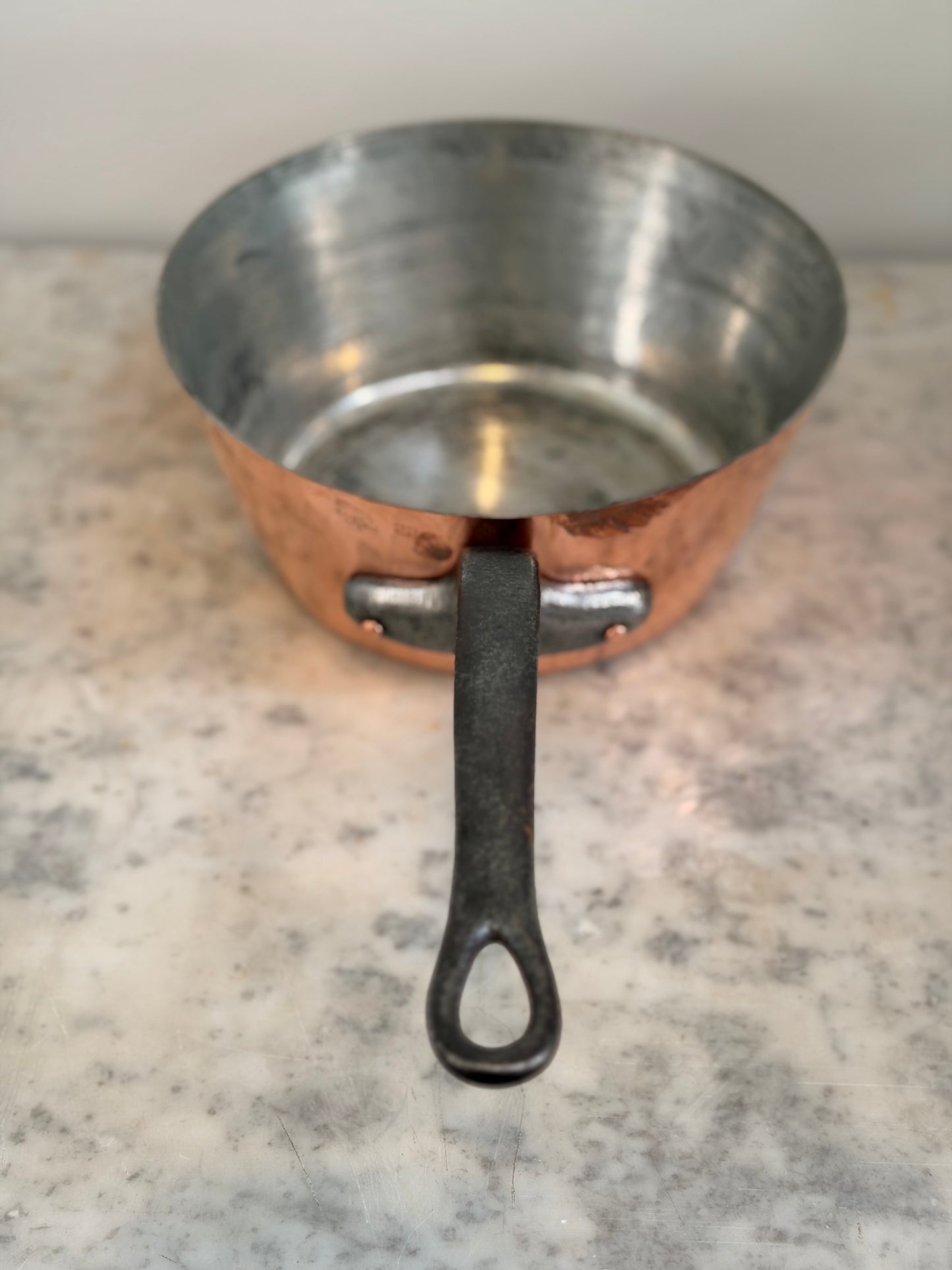 Set of 6 French L. LeCellier Villedieu hammered copper nesting pots with iron handles. Beautiful and heavy. A dreamy set. Each branded with makers mark.