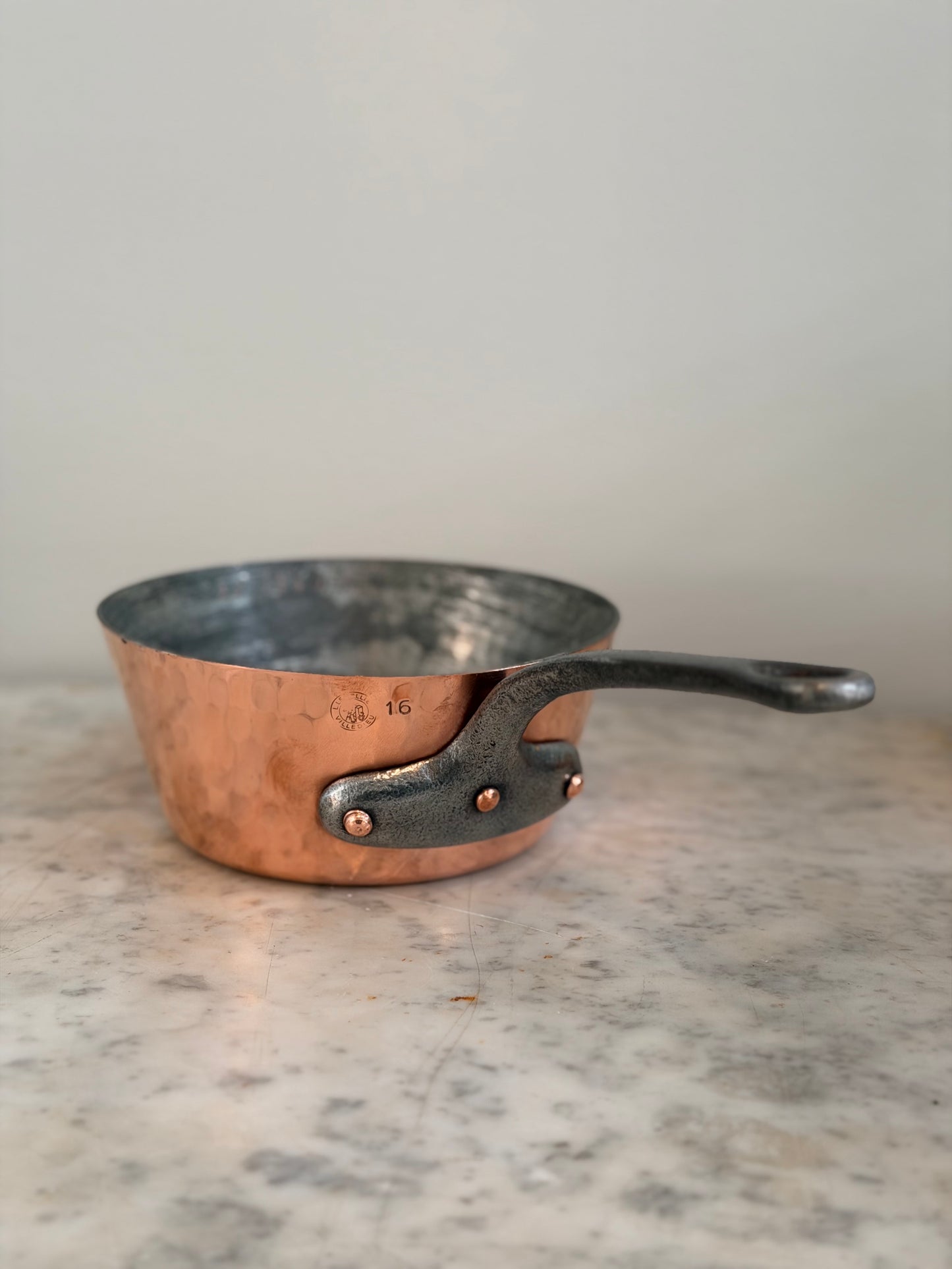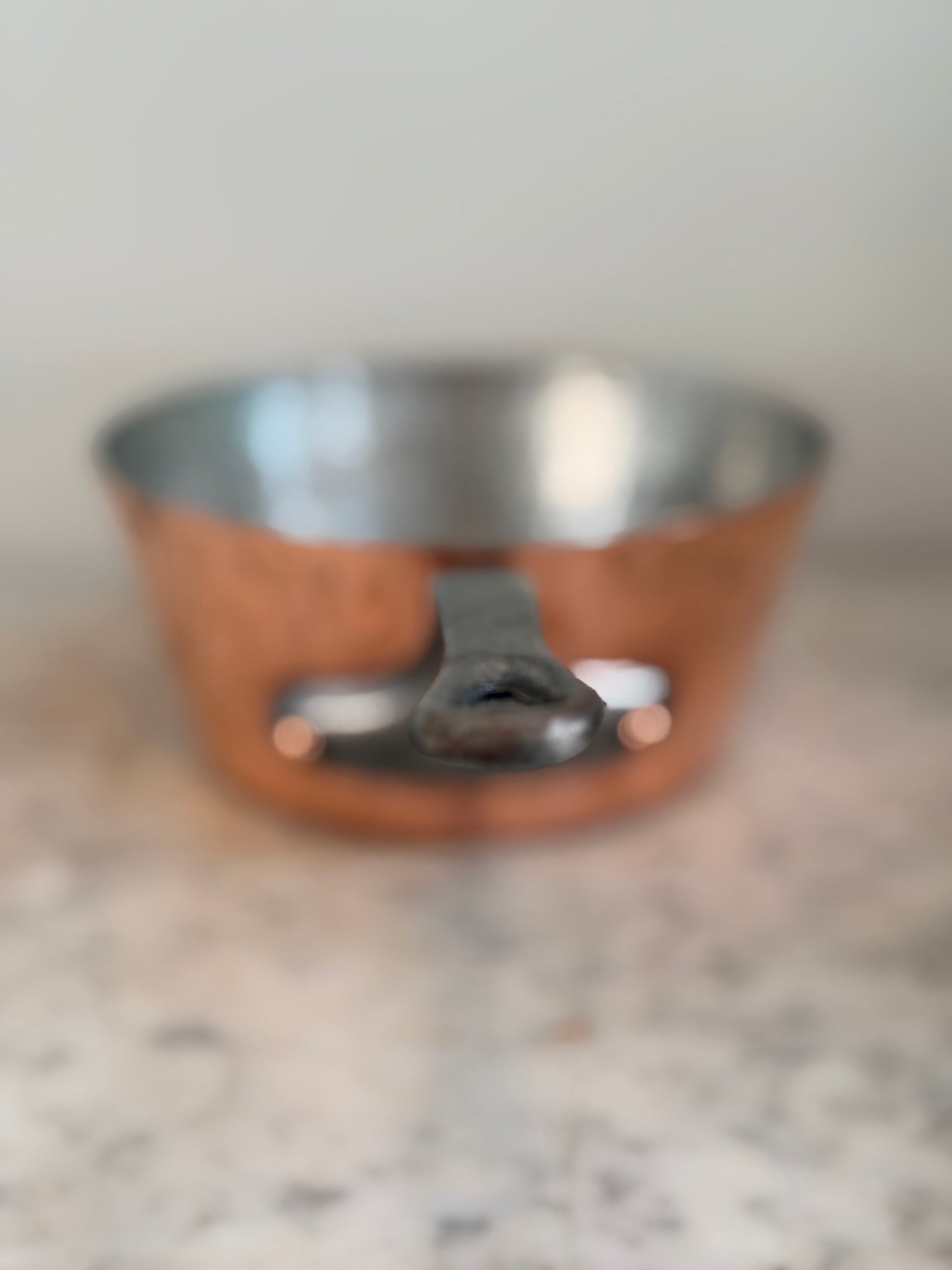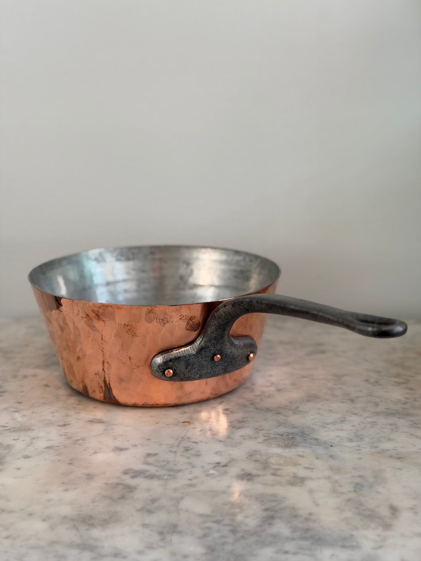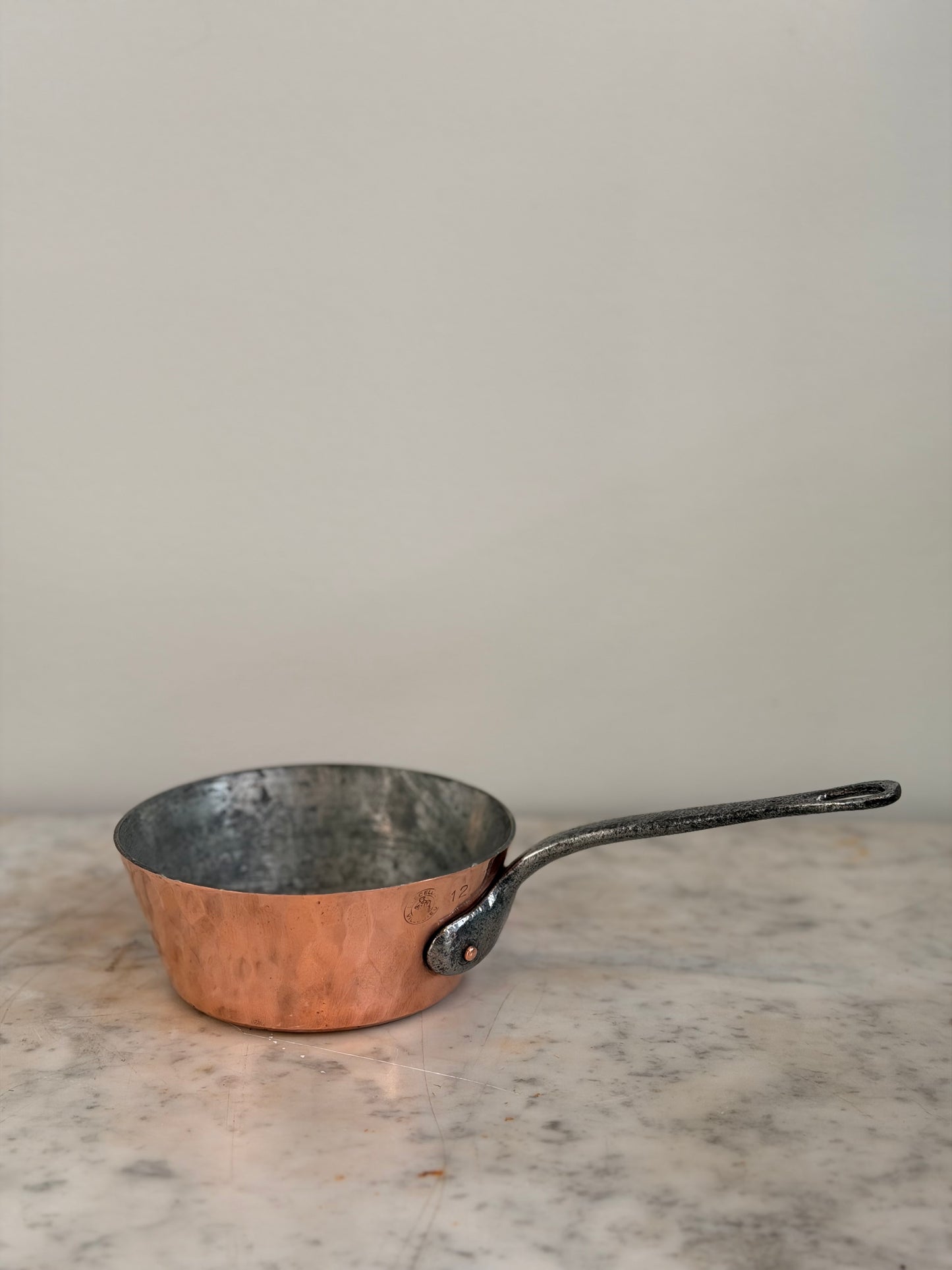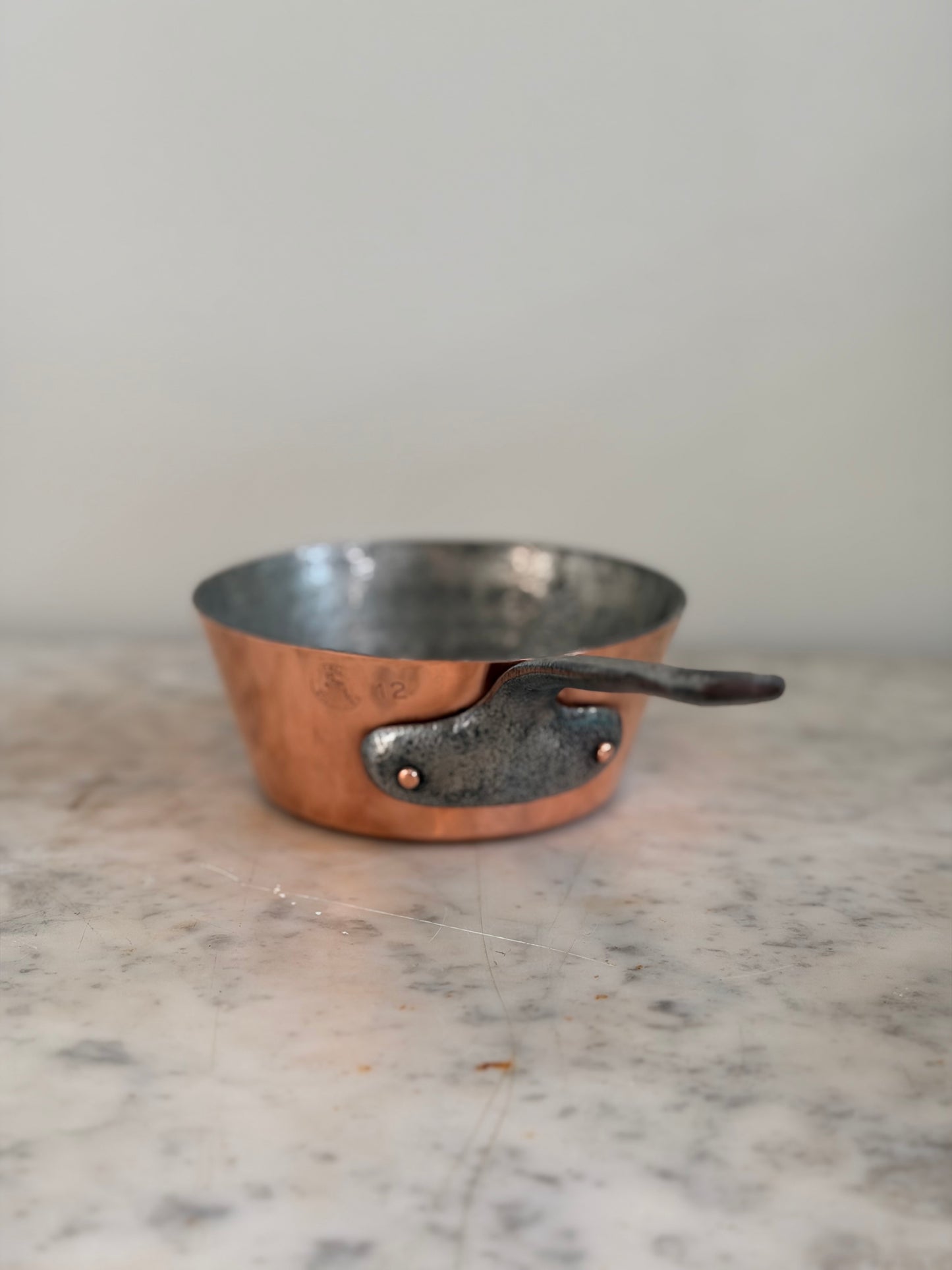 Set of 6 French L. LeCellier Villedieu hammered copper nesting pots with iron handles. Beautiful and heavy. A dreamy set. Each branded with makers mark.