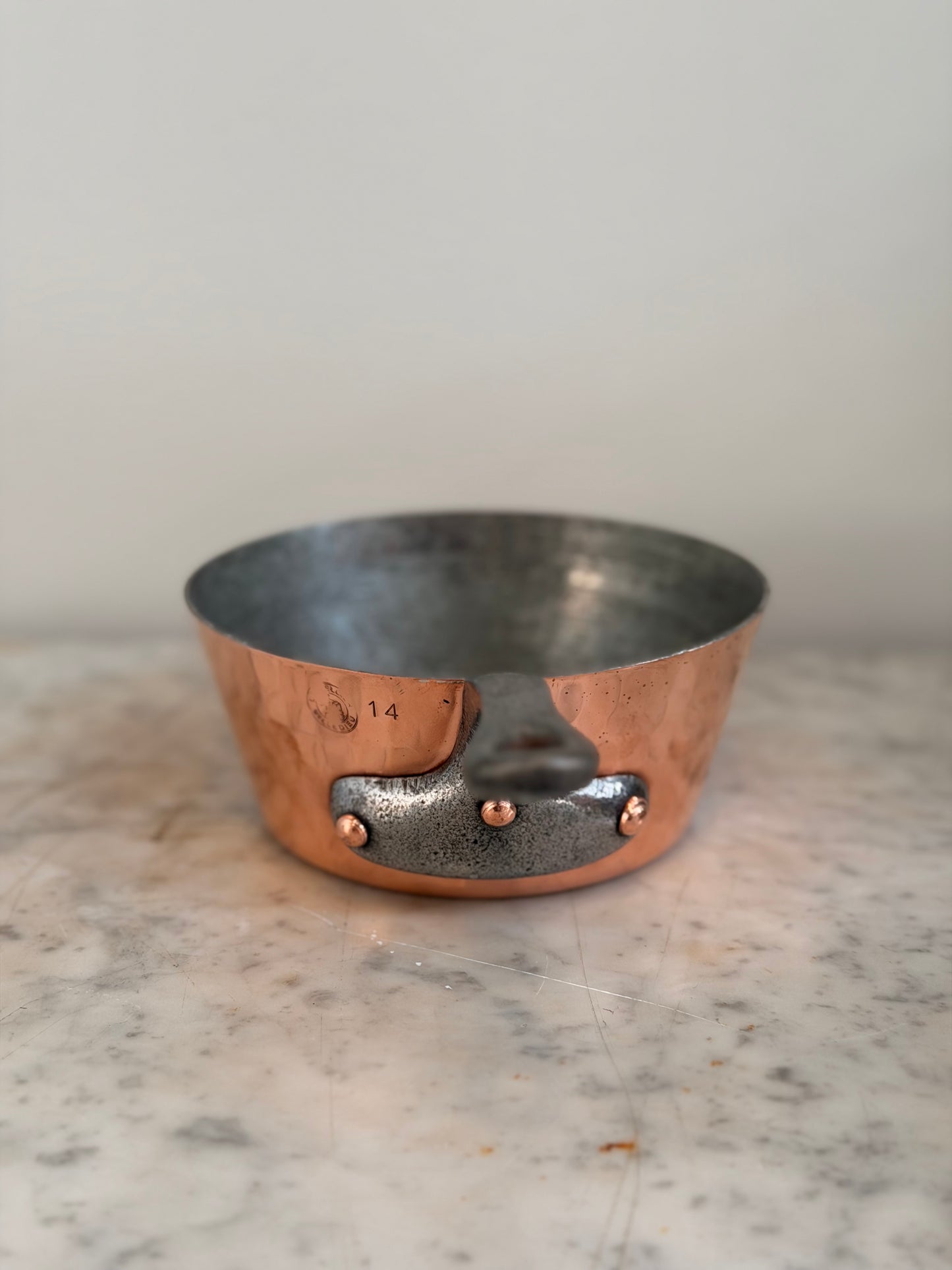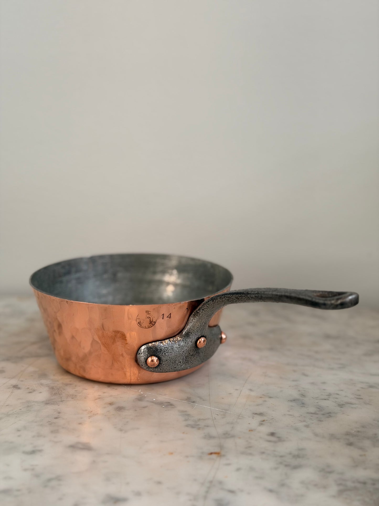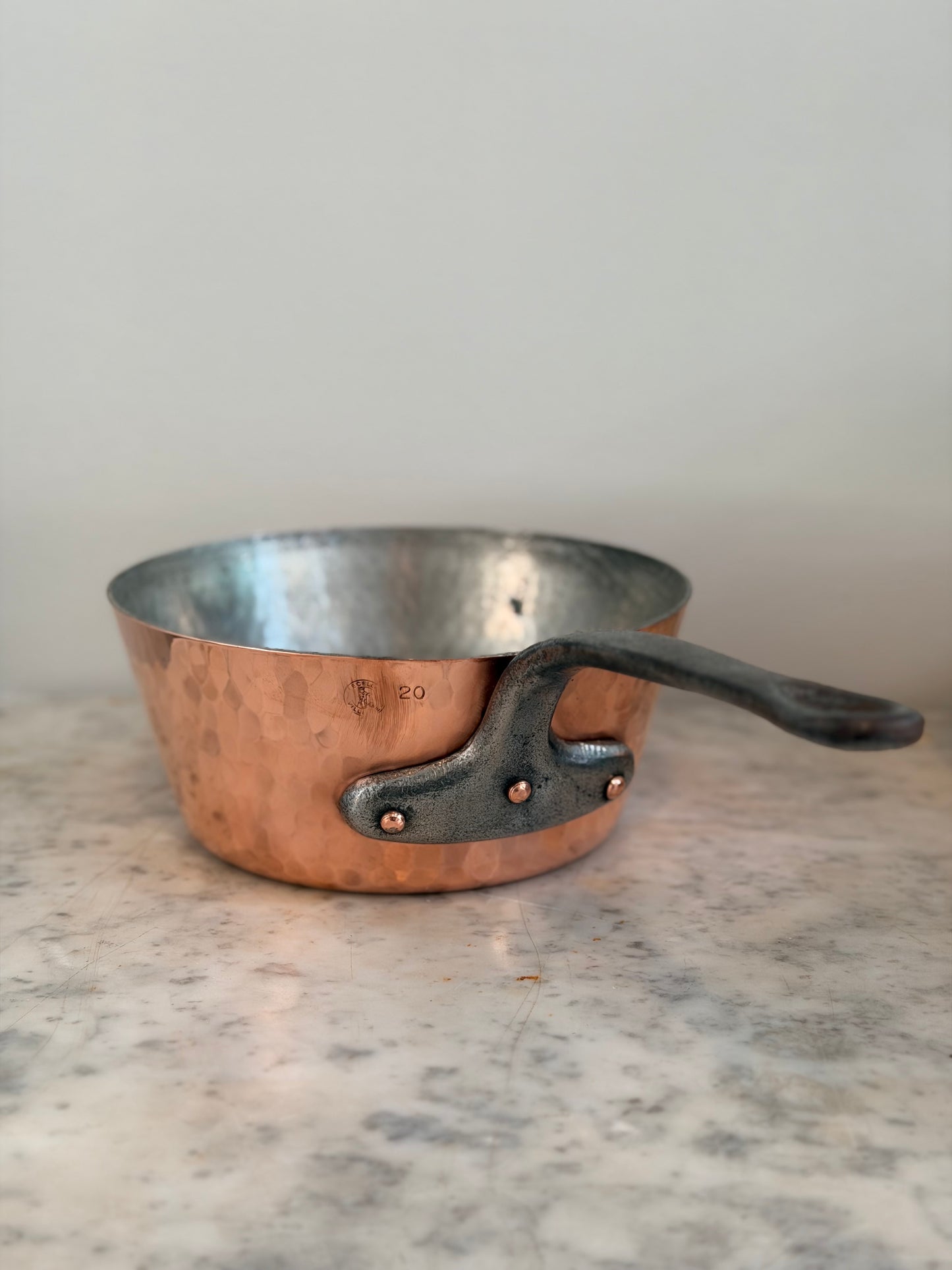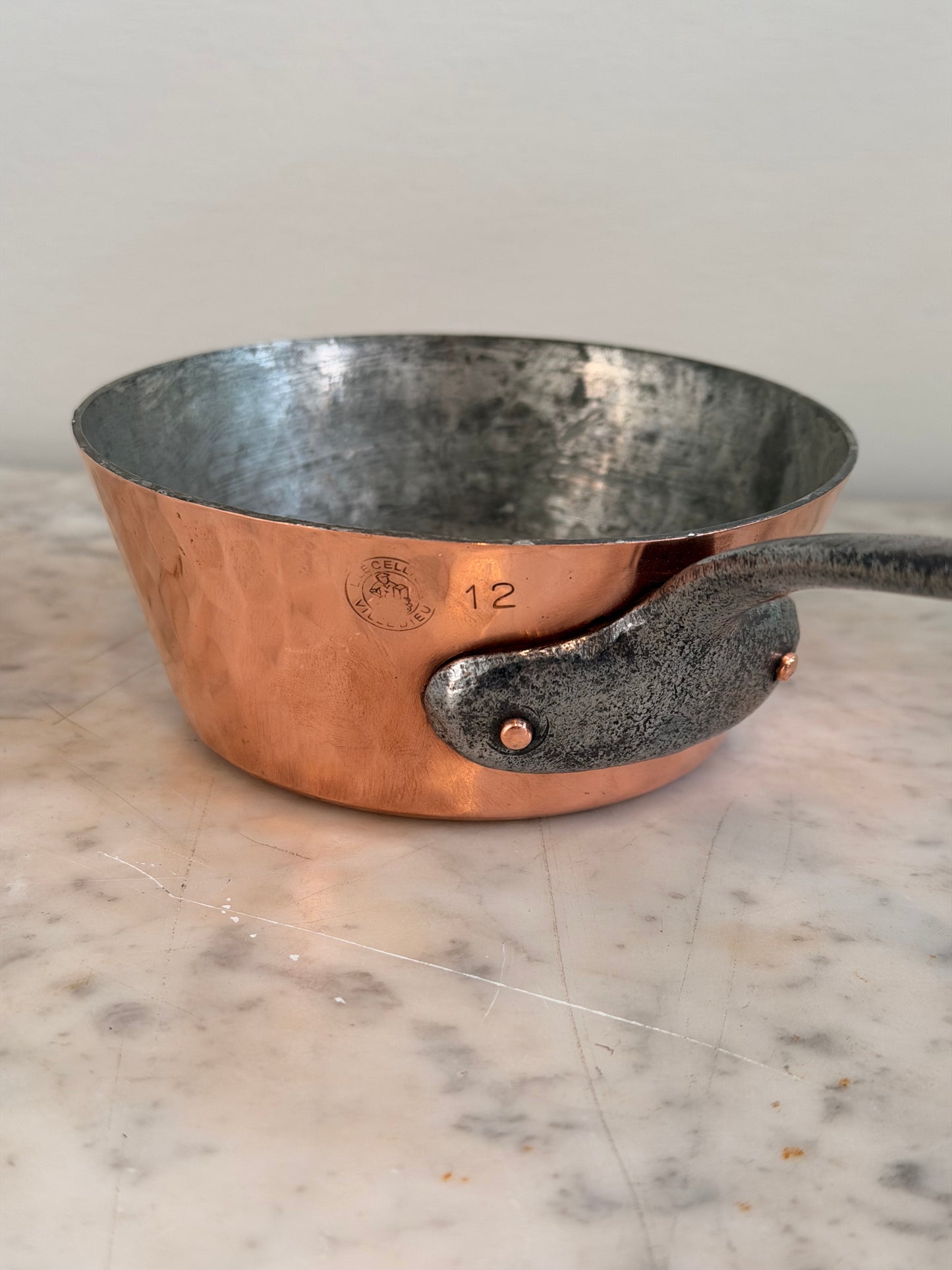 Set of 6 French L. LeCellier Villedieu hammered copper nesting pots with iron handles. Beautiful and heavy. A dreamy set. Each branded with makers mark.